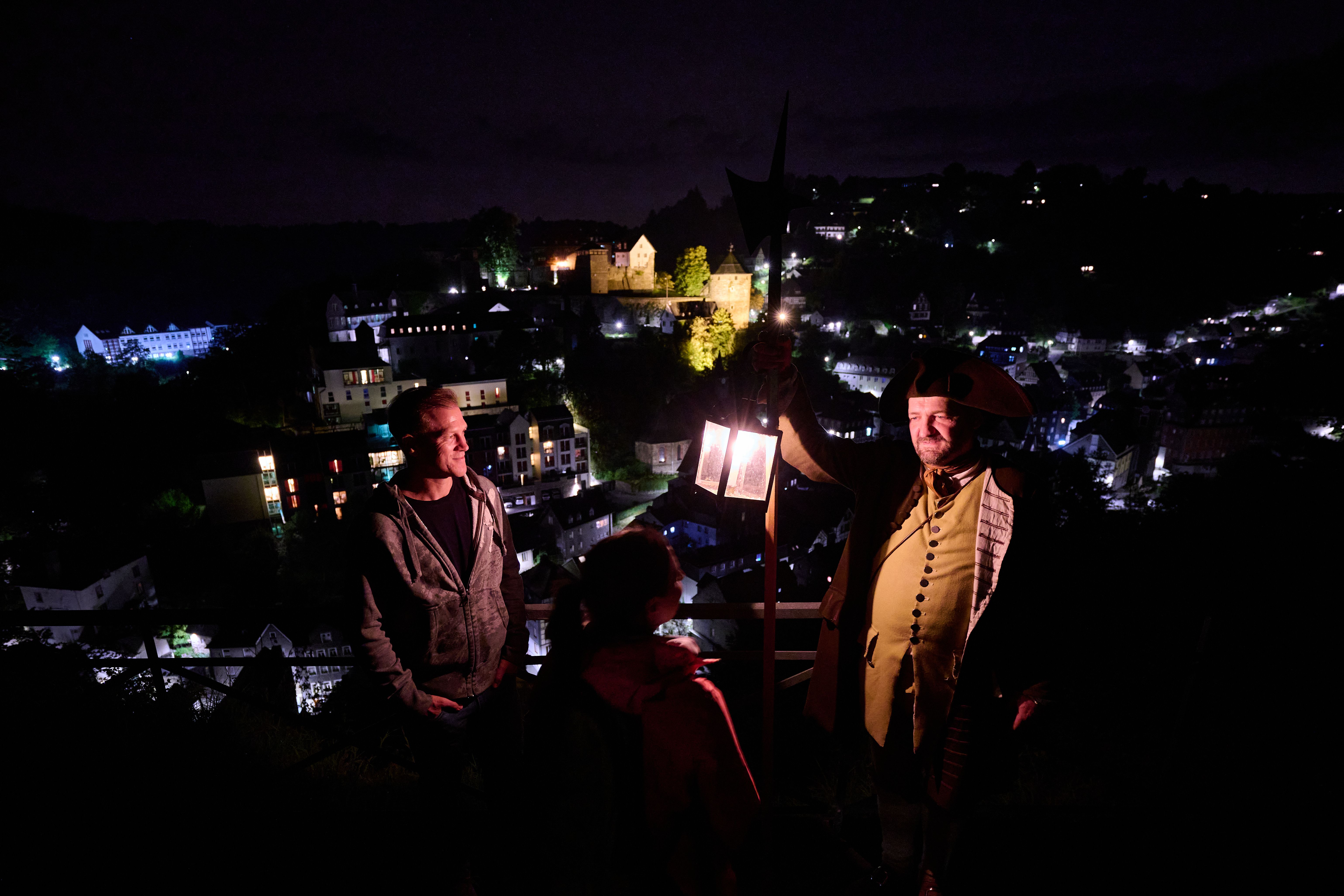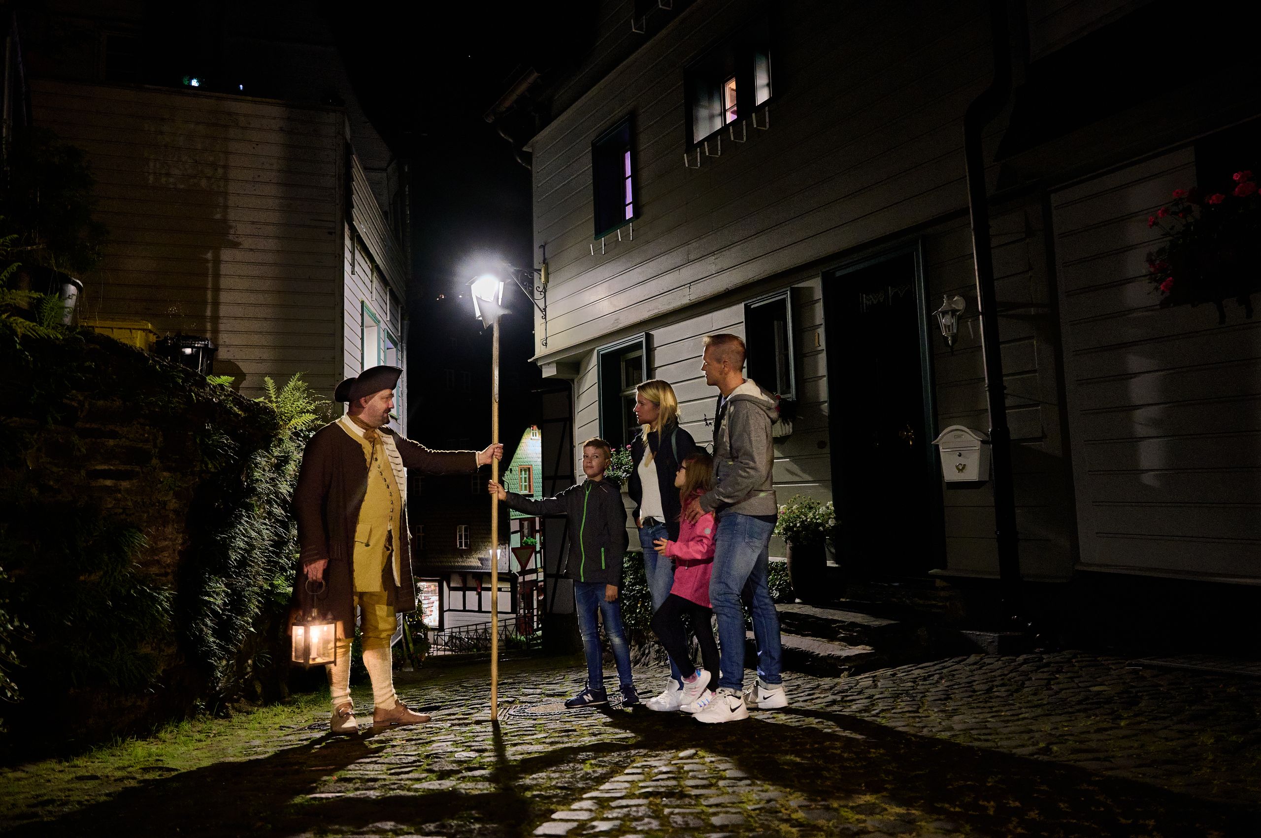 Begleiten Sie den Gästeführer im Kostüm des Nachtwächters auf seinem Rundgang und entdecken Sie den Reiz der Altstadt Monschau bei Nacht. Erfahren Sie Interessantes und Amüsantes über die Aufgaben und das Leben des Nachtwächters in früheren Zeiten.