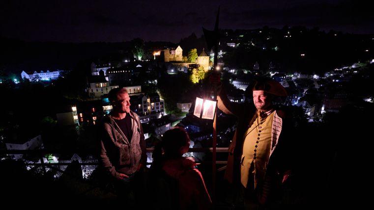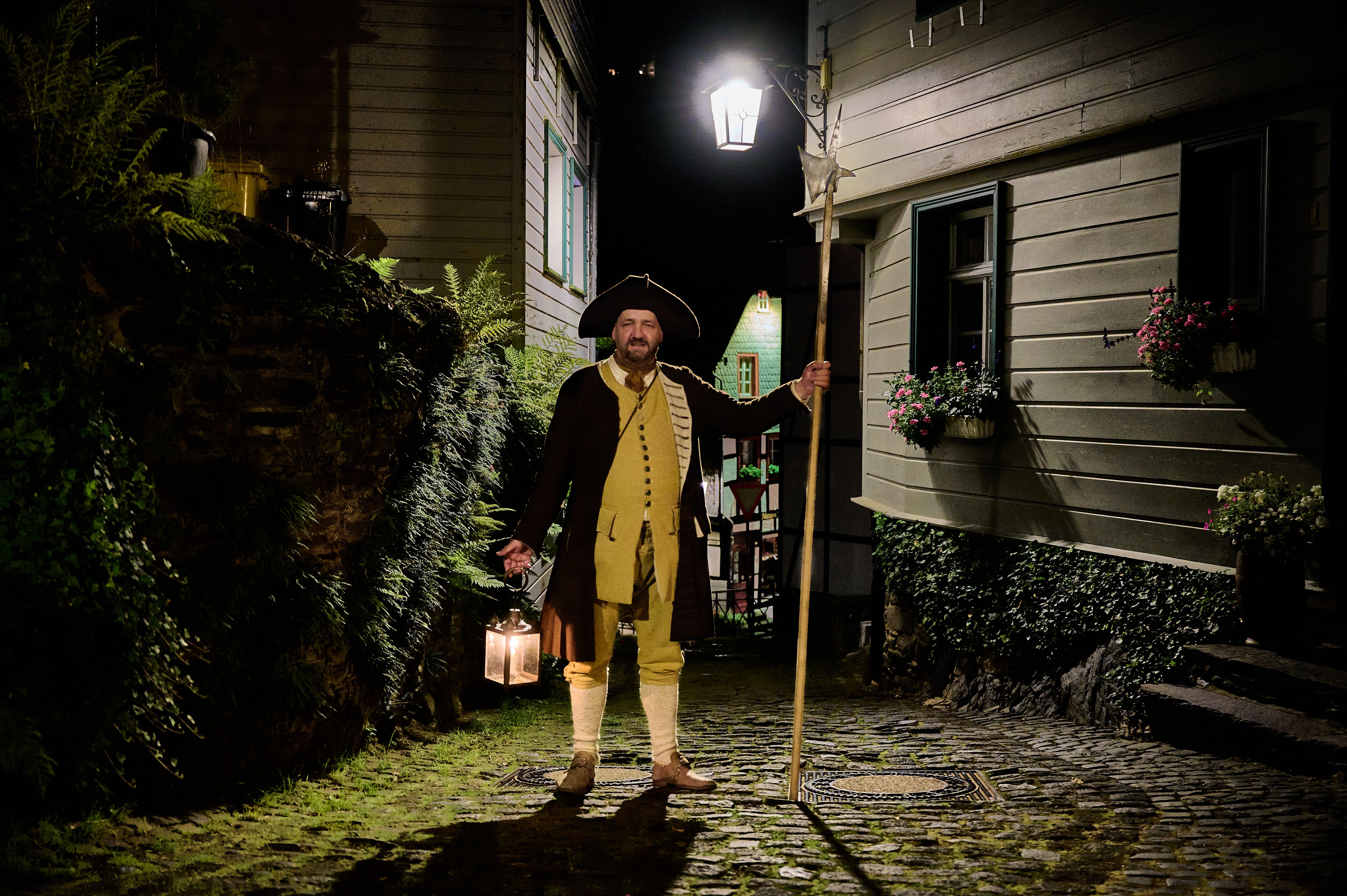 Begleite den Nachtwächter in seinem historischem Gewand auf einer Stadtführung durch die Altstadt von Monschau – ein besonderes Erlebnis in der Abenddämmerung.