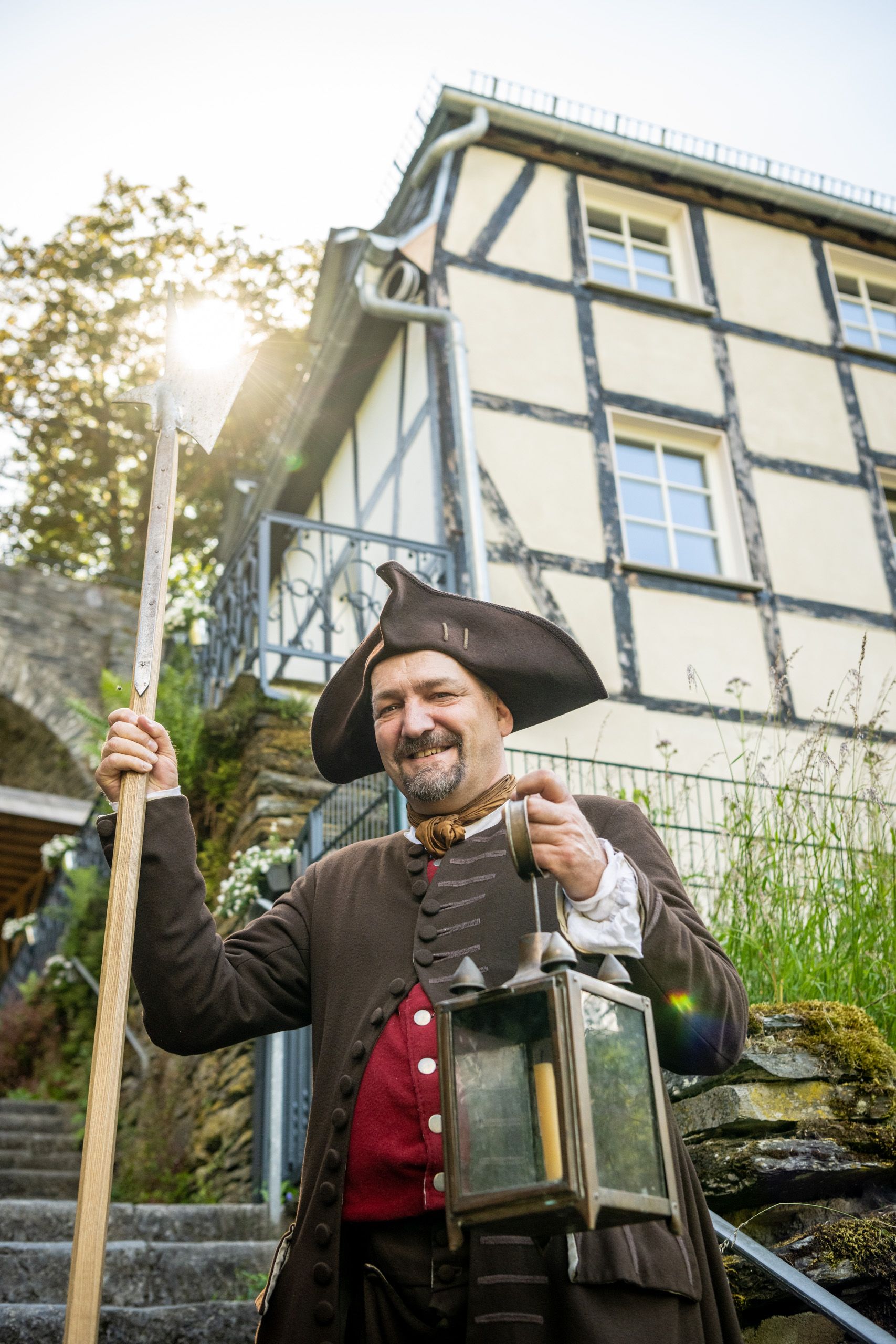 Begleite den Stadtwächter in seinem historischen Gewand auf einer spannenden Stadtführung und tauche ein in die Vergangenheit von Monschau.