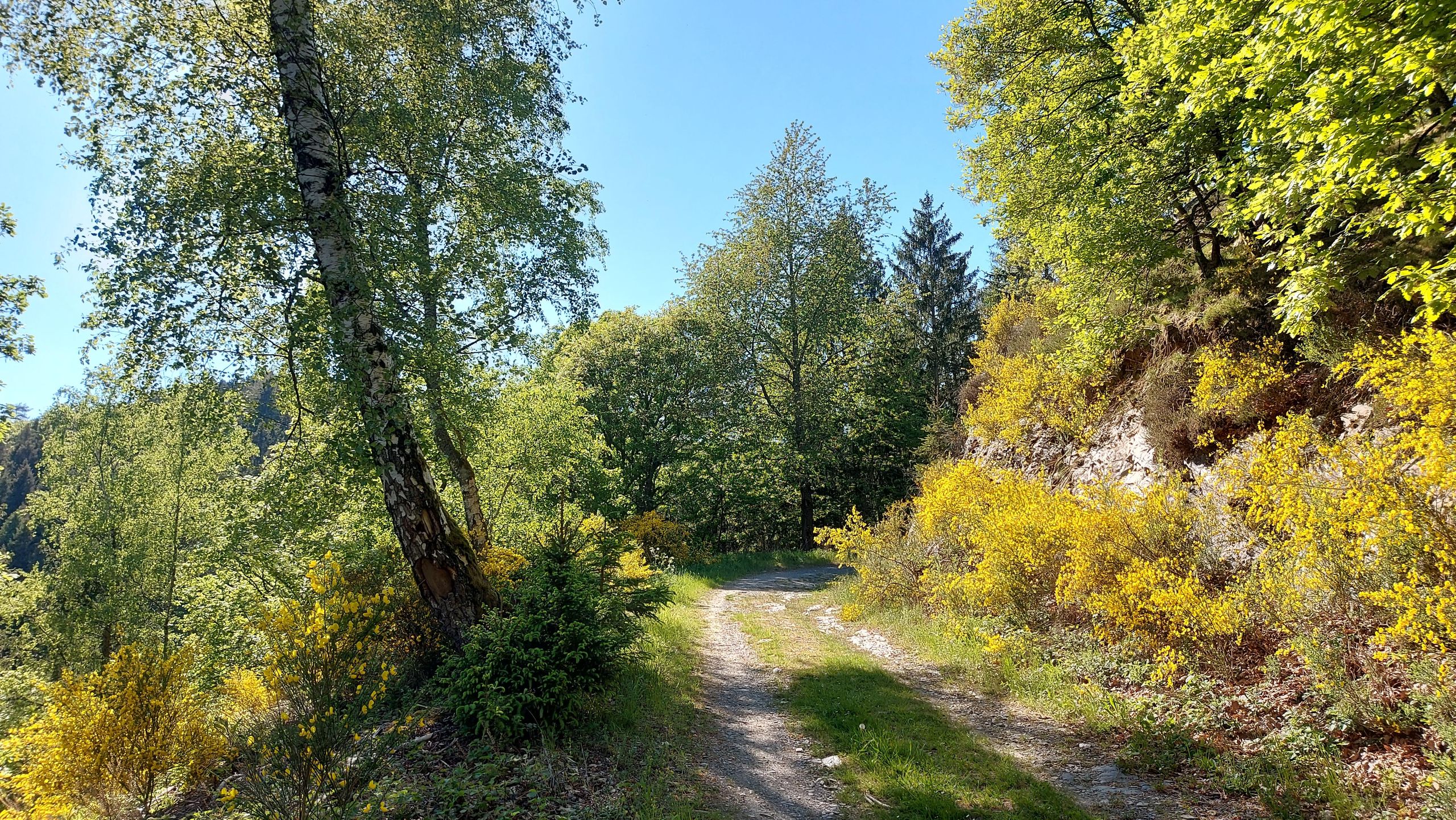 • Ein malerischer Weg umgeben von grünen Bäumen und bunten Sträuchern. Die Sonne scheint an einem klaren, blauen Himmel.