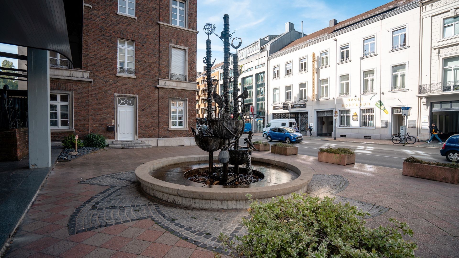 Der Brunnen des Friedens, errichtet während des zweiten Weltkongresses der Schmiede im Mai 1991 in Aachen, ist ein beeindruckendes Werk von 100 internationalen Schmieden. Mit einer Höhe von sechs Metern symbolisiert er das Leben, indem sich Pflanzen und Tiere um das Wasser gruppieren. Der Brunnen verkörpert nicht nur die Harmonie mit der Natur, sondern auch die globale Freundschaft und Zusammenarbeit.