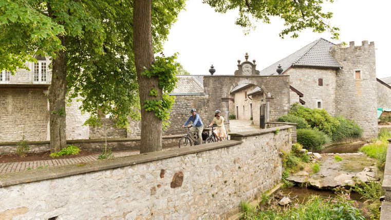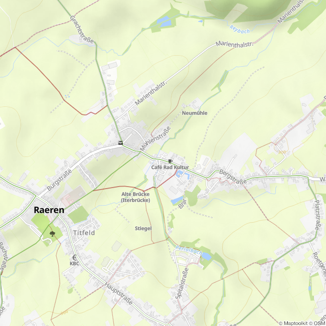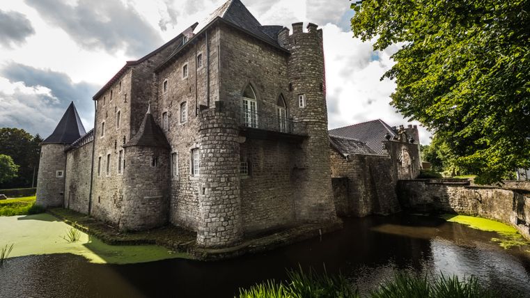Erbaut wurde die Burg in der Mitte des 14. Jahrhunderts auf dem Gelände einer alten Eisenschmelze, unmittelbar am Zusammenfluss von Iter- und Periolbach gelegen. Johan van den Roideren ist der erste urkundlich erwähnte Besitzer dieses Lehens des Aachener Marienstiftes. Der ursprüngliche Wohnturm, der von großen Weihern umgeben war, wurde im Jahre 1583 nach einem Brand von dem damaligen Besitzer Philip von Lomont restauriert und um fast das Doppelte vergrößert. Er ließ einen Teil des Wassergrabens mit Schutt aus den umliegenden Töpfereibezirken auffüllen. Darauf baute er einen Anbau an der Stelle des ehemaligen Küchenbaus. Das Datum dieses Umbaus ist über der heutigen Eingangstür und in einem Stein der Umfassungsmauer des Wassergrabens eingemeißelt. Nachdem die Burg im 18. Jh. baufällig geworden war, ließ Peter Joseph de Nys die Burg nochmals umbauen. So entstand die heutige Anlage mit hohem Turm, Balkon und der jetzigen Zufahrt mit Torbogen. Seit 1960 ist die Burg Raeren im Besitz der Gemeinde Raeren. 1963 wurde hier das Töpfereimuseum Raeren eingerichtet, das seitdem zu den wichtigsten Spezialmuseen Belgiens gehört und internationalen Ruf genießt.