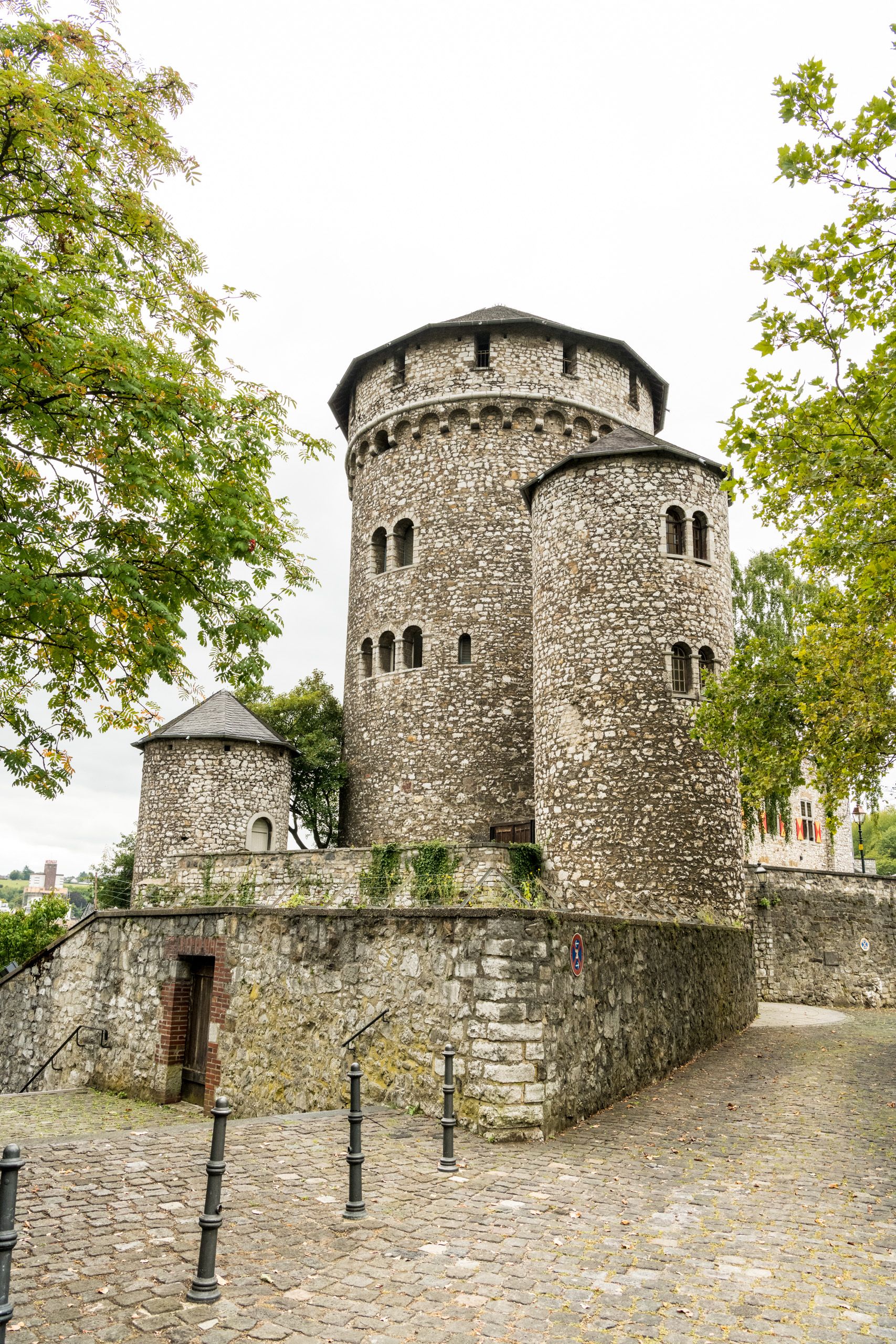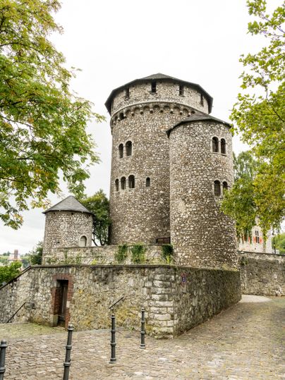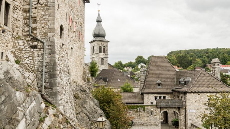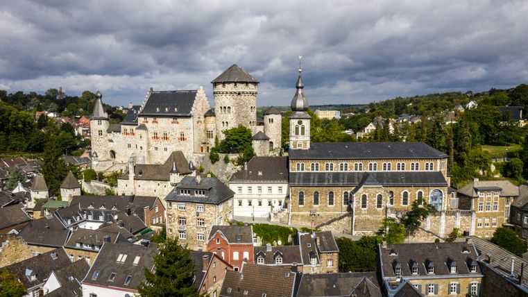 Sie liegt mit ihren Gebäuden, Türmen, Umfassungsmauern und Wehrgängen auf einem mächtigen Kalksteinfelsen oberhalb des Vichtbachtales. Die starken Mauern sind so kunstvoll in den Felsen verankert, dass die ganze Burganlage wie aus einem Gestein herausgewachsen scheint. Die aus dem 12. Jh. stammende Burganlage wird heute vorwiegend als Veranstaltungs- und Begegnungsstätte genutzt. Im Obergeschoss befindet sich die Burg-Galerie, ein großzügig angelegter Raum, in dem regelmäßig Kunstaussellungen stattfinden. Das Mittelgeschoss mit Rittersaal und Kemenate dient als Veranstaltungsort für Konzerte und Feiern. Im Laufe ihrer langen Geschichte wurde die Burg mehrmals zerstört und wieder aufgebaut. Durch die exzessive Verwendung von Stilelementen des Historismus wurde bei dem um 1900 durchgeführten Wiederaufbau der stark verfallenen Burg der Charakter der Anlage stark verfremdet. Nach erneuter Teilzerstörung während des zweiten Weltkriegs wurde die Burg in den 1950er Jahren so wieder aufgebaut, wie sie zu Anfang der 18. Jh. ausgesehen hatte, sodass unser Stolberger Wahrzeichen jetzt wieder in historisch weitgehend korrekter Form vorliegt. An der westlichen Seite des Hofes führt zwischen dem Hauptbau und dem vorgelagerten Rundturm ein Treppenabgang zum unteren Burghof. Hier taucht die moderne Industriekulisse des ehemaligen Hammerfeldes auf, wo sich aus den ersten Anfängen im 15. Jh. zunächst ein Gewerbe- und später ein Industriestandort entwickelte. Der untere Burghof gibt den Blick frei auf die eindrucksvolle Blausteinformation des Burgfelsens mit der darauf thronenden Burg. Auf der anderen Seite befindet sich der etwas tiefer gelegene und ebenfalls zugängliche Burgkräutergarten. Nach Osten schließt sich die trutzig wirkende Torburg mit ihrem malerischen Innenhof an. Dieser Gebäudekomplex entstand kurz nach 1900 im Zuge eines Burgumbaus. Trotz seiner späten Entstehung wirkt dieses Teilensemble nicht als Fremdkörper, sondern trägt durchaus zum romantischen Flair der Gesamtanlage bei. In der Torburg befindet sich ein heimatkundliches Museum.