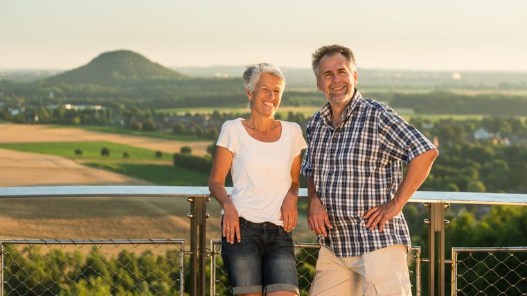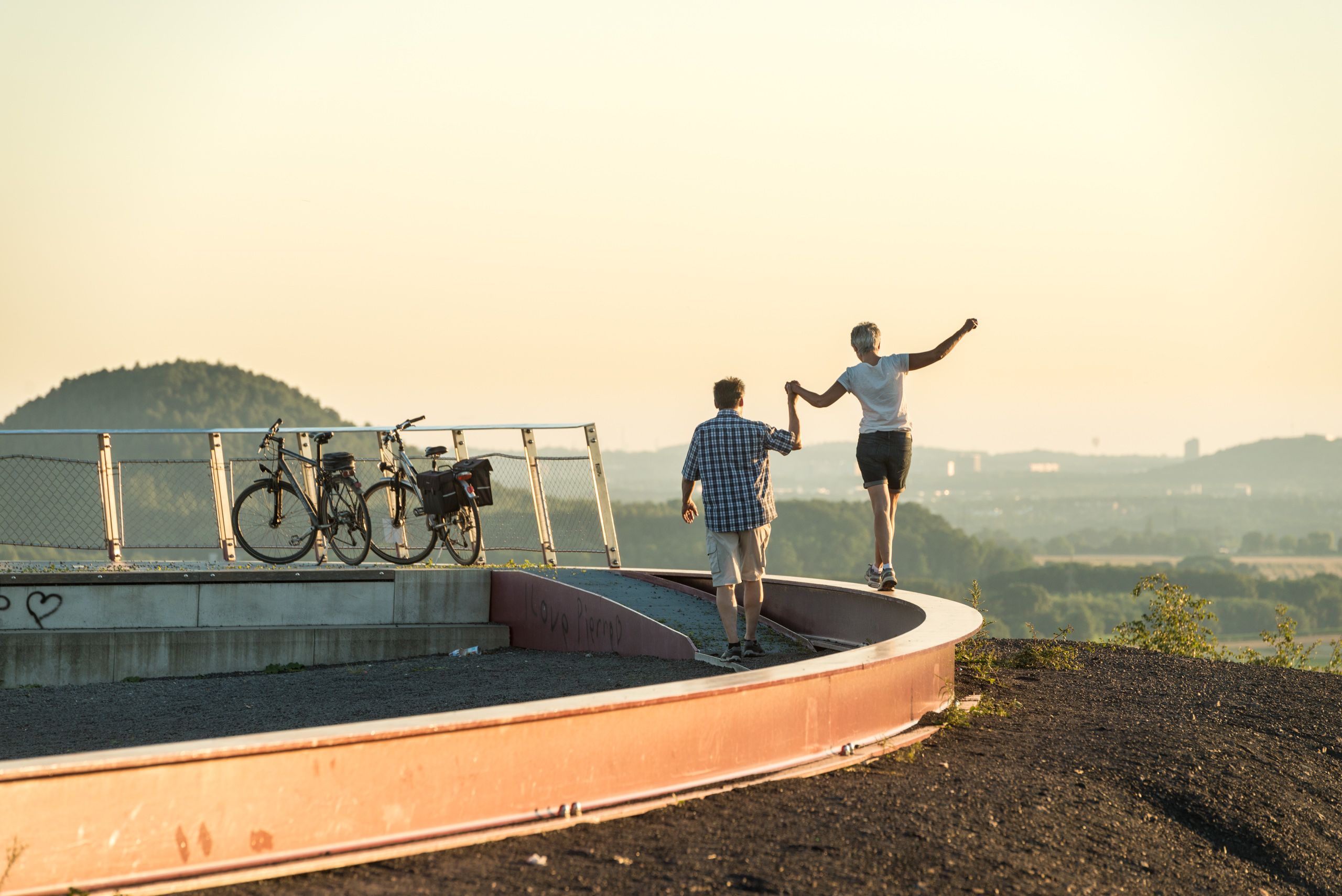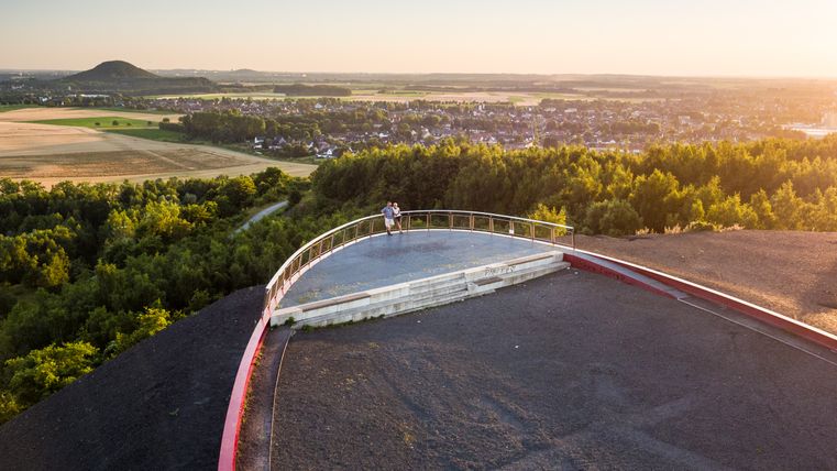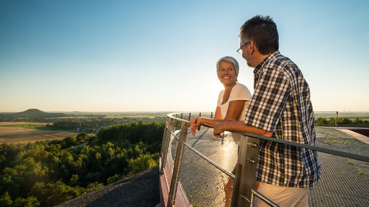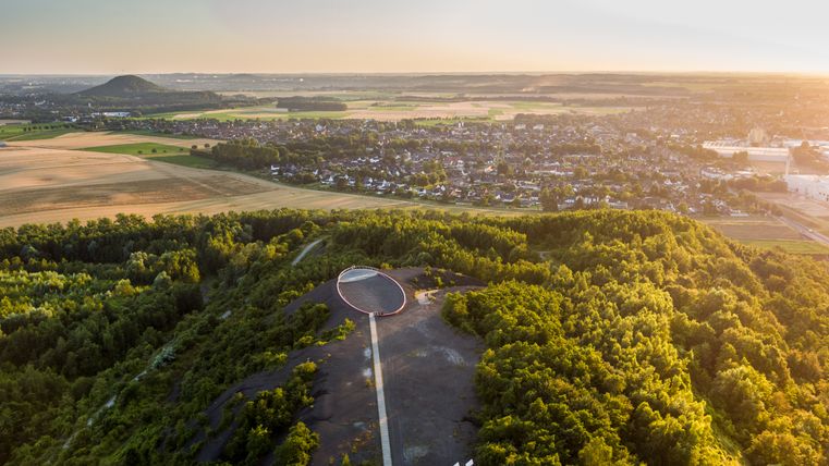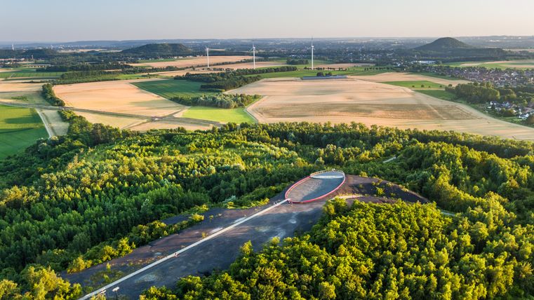 Der Aufstieg auf den Berg erfolgt über eine im Bergfoyer installierte Treppenanlage. Sie führt die Besucher über eine 25 Meter lange Hängebrücke in den Schwebesteg, der sechs bis zehn Meter über dem Boden den Hang hinauf führt. Das Bergplateau ist als Aussichtsplattform an der Südwestflanke angelegt. Gestaltet wurde dieser Punkt als ruhiger Ort zum Verweilen und Ausruhen mitten im Naturschutzgebiet.