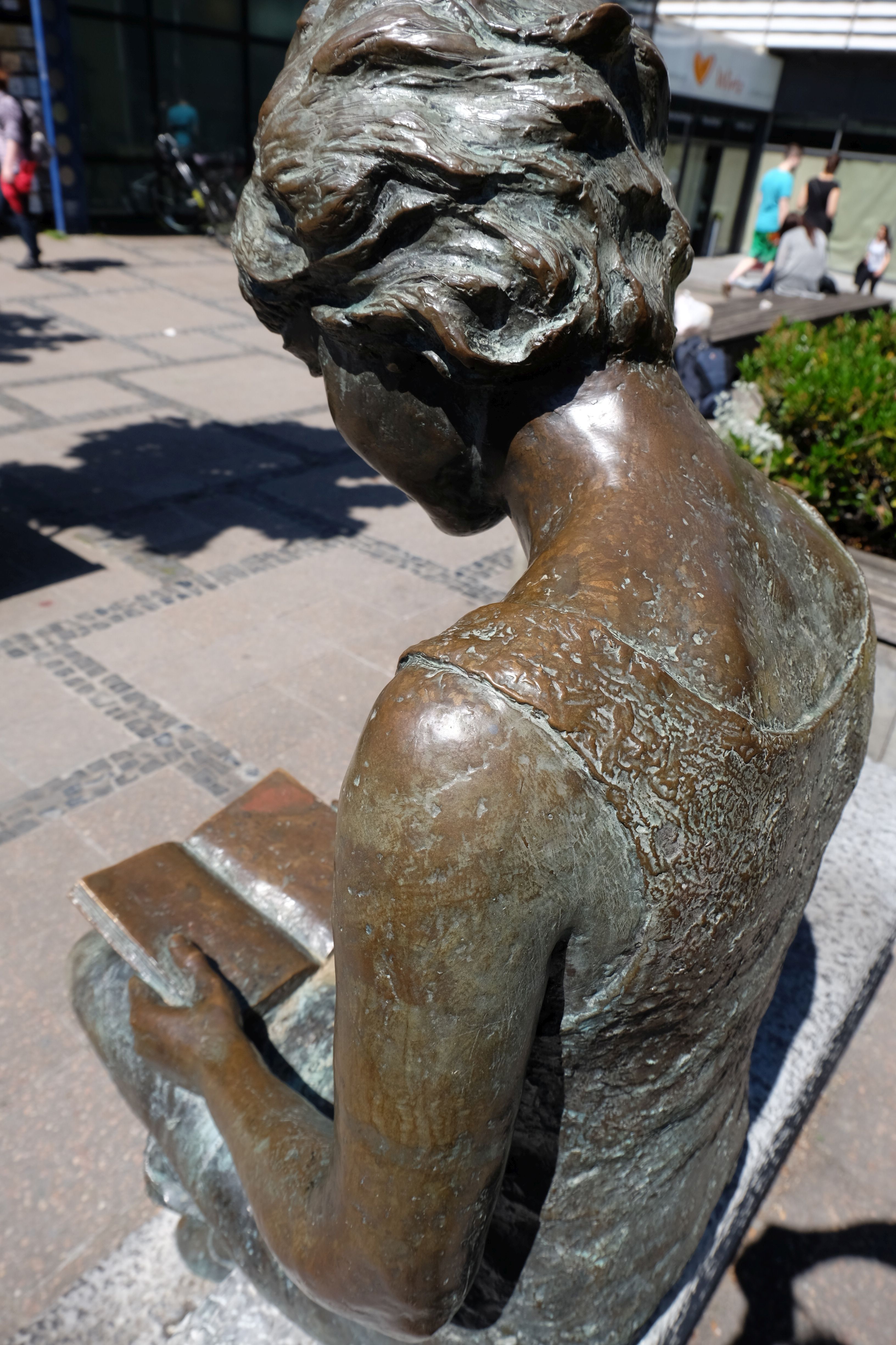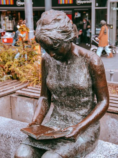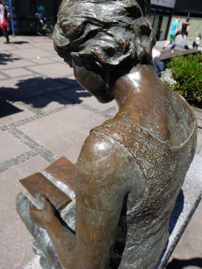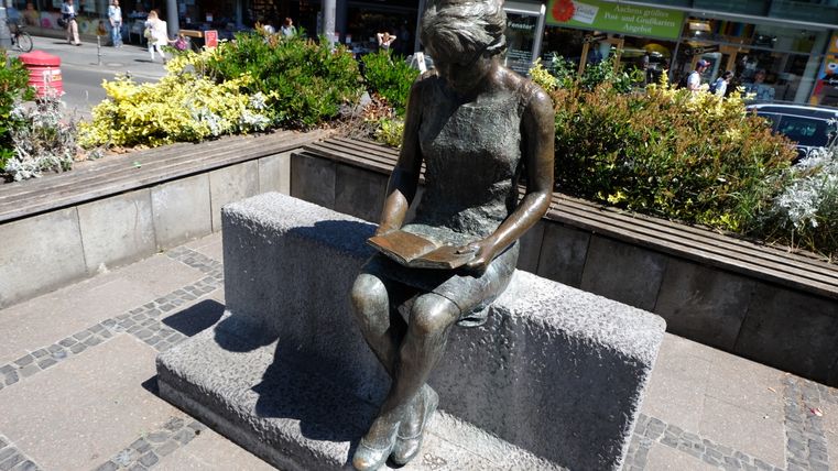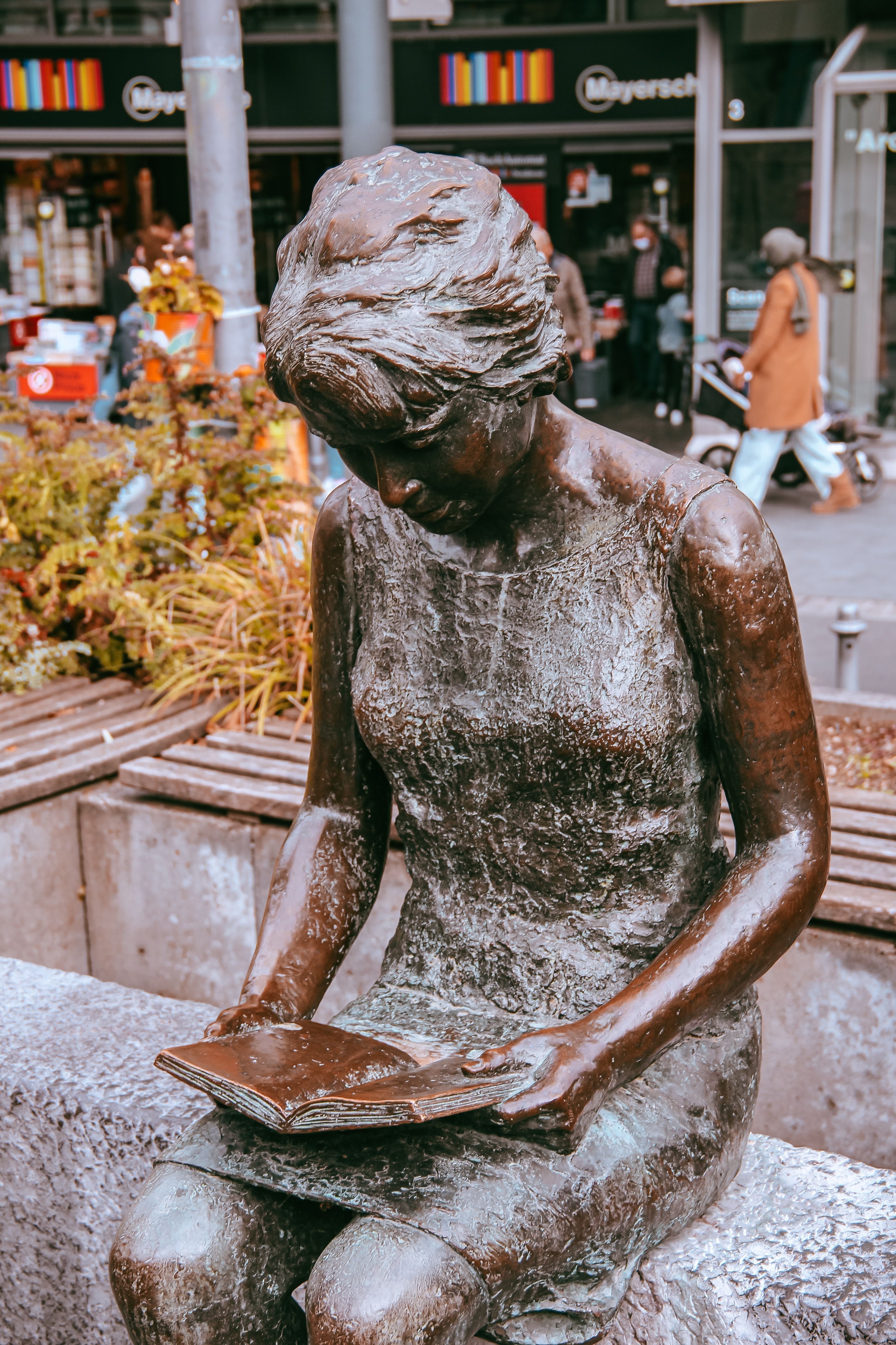 Wolf Ritz hat die Bronzeskulptur 1985 zum Anlass der Eröffnung des Buchhauses Treffpunkt Taschenbuch der Mayerschen Buchhandlung erbaut. Die Bronzefigur ist eine auf dem Steinsockel sitzende Dame, die in das vor ihr aufgeschlagene Buch vertieft ist. Der deutsche Bildhauer möchte mit diesem Werk auf den Anspruch auf Auseinandersetzung mit den geistigen Werten aufmerksam machen.