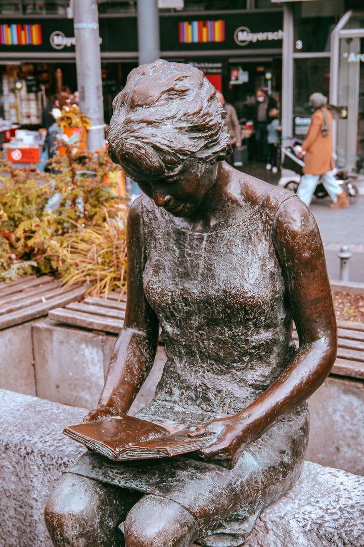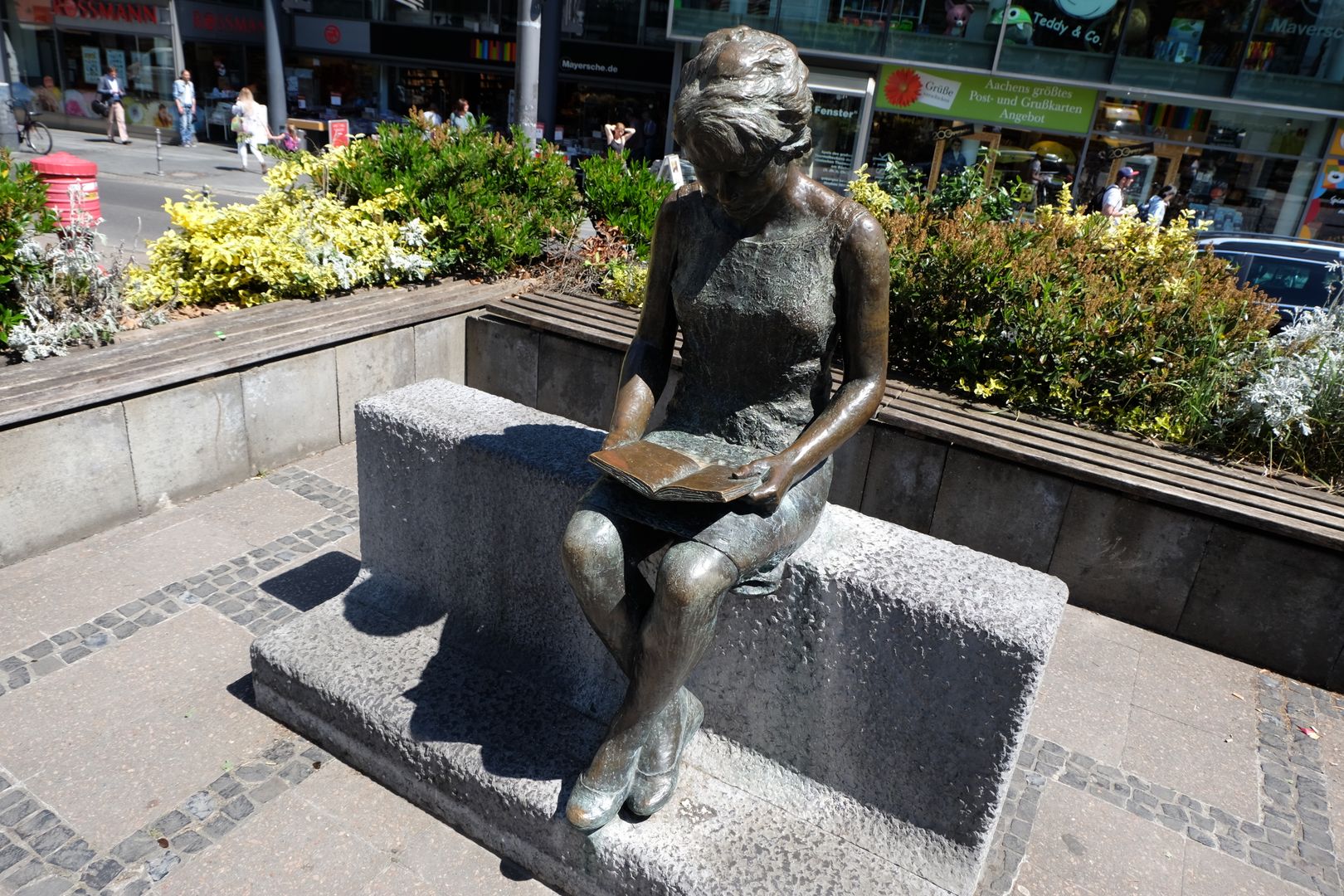 Die Bronzeskulptur "Die Lesende" von Wolf Ritz wurde 1985 zur Eröffnung des Buchhauses Treffpunkt Taschenbuch der Mayerschen Buchhandlung geschaffen. Sie zeigt eine Dame, die auf einem Steinsockel sitzt und in ein aufgeschlagenes Buch vertieft ist. Dieses Werk des deutschen Bildhauers betont die Bedeutung der Auseinandersetzung mit geistigen Werten und lädt zur Reflexion ein.
