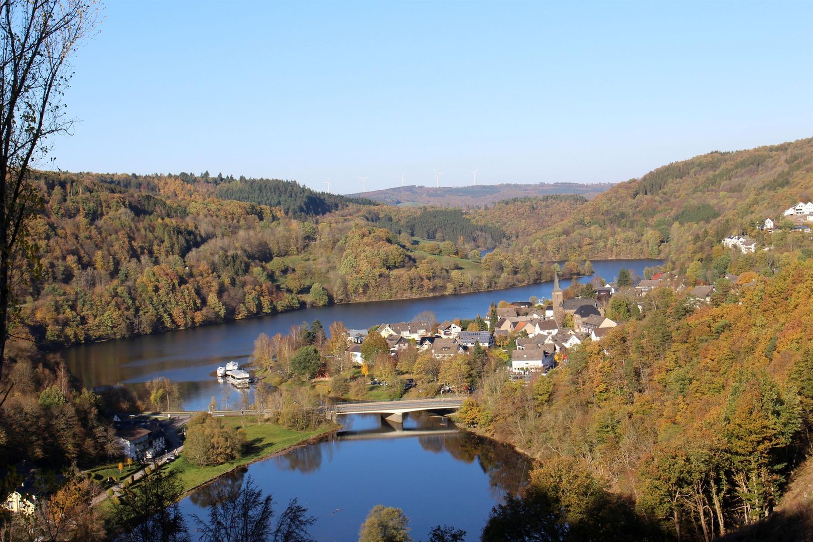 Auf einer Höhe von 360m liegt der Eifel-Blick „Wolfshügel“ hoch über Einruhr. Diese exponierte Lage ermöglicht einen fantastischen Blick auf das sehenswerte Eifelörtchen. Über den Ort hinweg erstreckt sich ein einmaliger Fernblick über den Obersee bis hin zu dem Waldgebiet Buhlert. Die im Vordergrund sichtbare Rurbrücke wurde im 19. Jahrhundert erbaut und war die erste Steinbrücke, die über die Rur führte.
