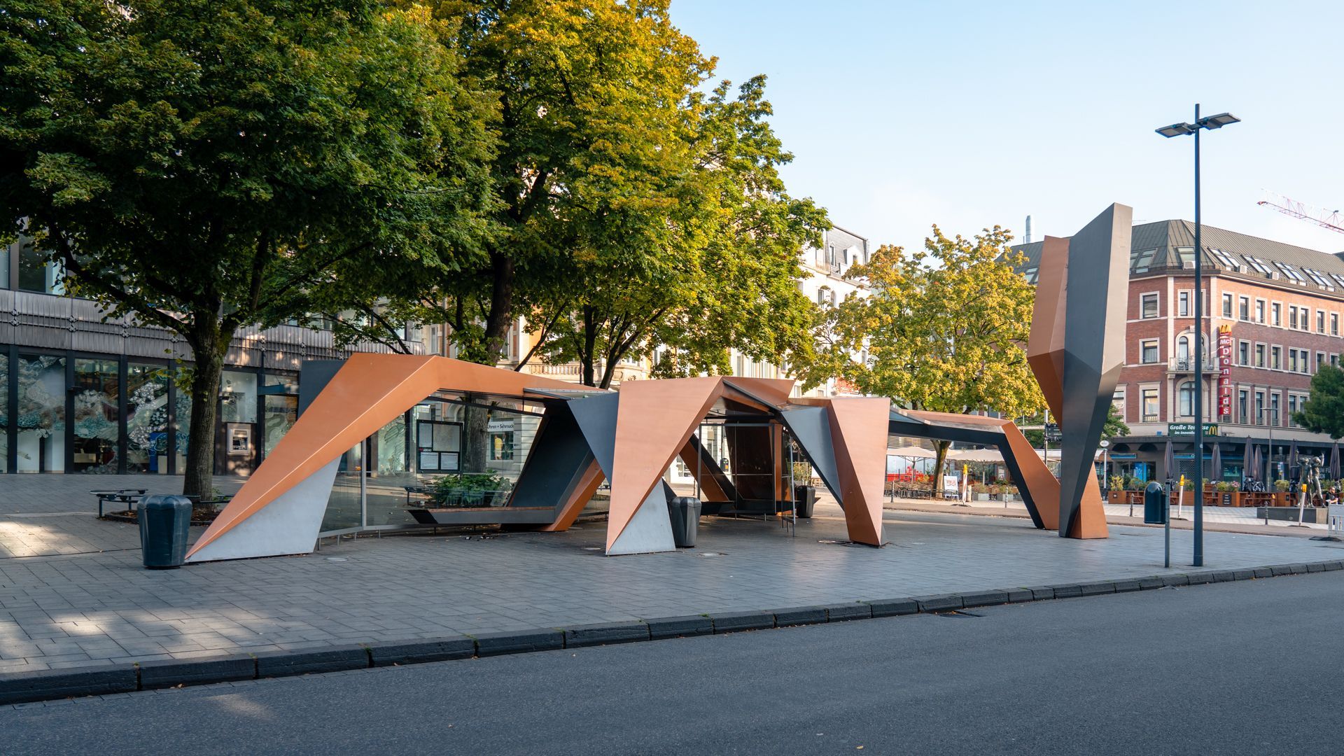 1998 gestaltete der amerikanische Architekt Peter Eisenmann den skurrilen Warteunterstand am Elisenbrunnen. Weil seine Form von den Aachenern mit einer Frittenzange verglichen wurde, trägt der Warteunterstand seither den Namen Frittezang.