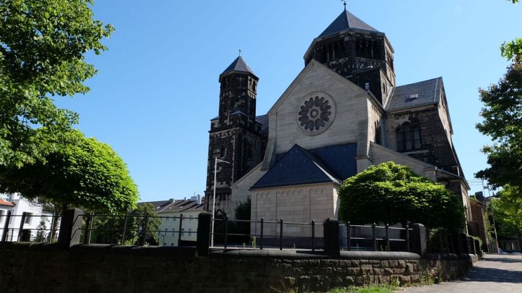 Die neoromanische Pfarrkirche entstand zwischen 1908 und 1910 nach Plänen des Architekten Josef Kleesattel und befindet sich am Ende der Viktoriaallee. Das Mosaik über dem Altar im Inneren der Kirche ist nach dem des Aachener Domes das zweitgrößte Mosaik im Bistum Aachen.