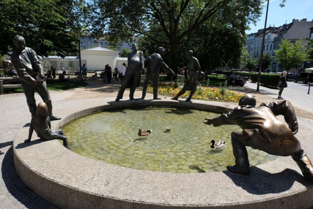 Der Brunnen wurde 1976 von Karl-Henning Seemann erschaffen. Die Personen symbolisieren den Geiz, die Gier, die Gönnerhaftigkeit und die Bettelei. Wie auch das Geld fließt das Wasser im Brunnen das ganze Jahr über, da dieses aus den Thermalquellen gespeist wird. Vor allem im Sommer ist der Brunnen ein beliebter Treffpunkt für Aachener und Gäste, für Klein und Groß, die in dem fließenden Wasser eine willkommene Abkühlung suchen.