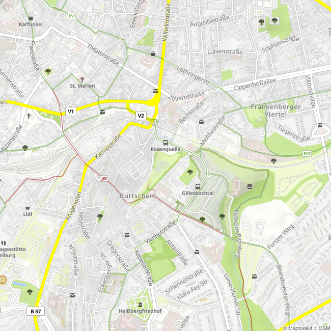 Jeder Kurort braucht auch einen Kurpark. In Burtscheid wurde dieser in seiner Größe und Nutzung im Laufe der Zeit oft verändert. Ursprünglich floss im Burtscheider Tal das Thermalwasser, durch das Abpumpen der Rosenquelle ist es jedoch überwiegend versiegt oder überbaut. Im Zentrum des Kurparks befinden sich heute die Kurpark Terrassen, die als Restaurant oder als Ort von Veranstaltungen mit einem schönen Blick auf den Kurpark einladen.