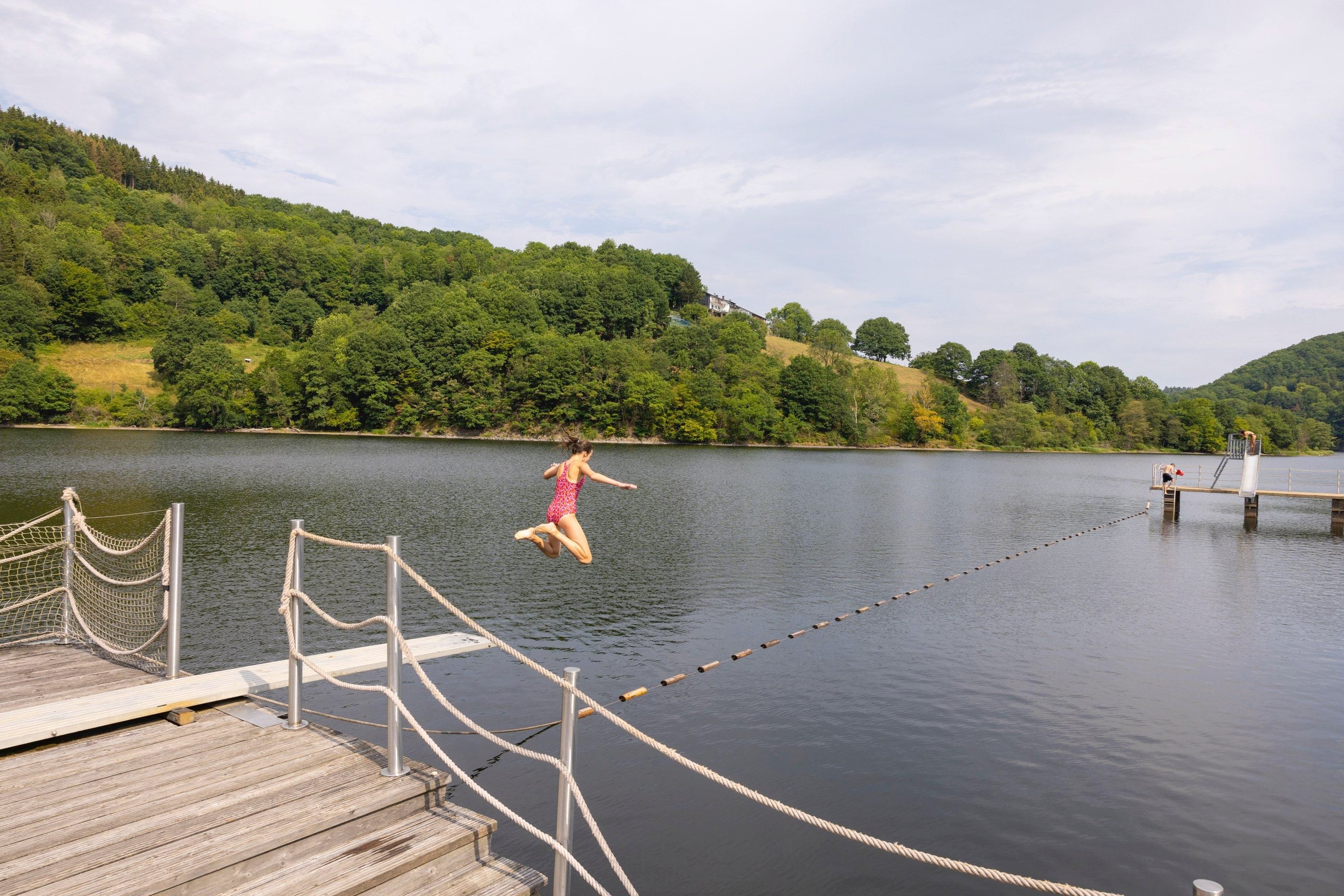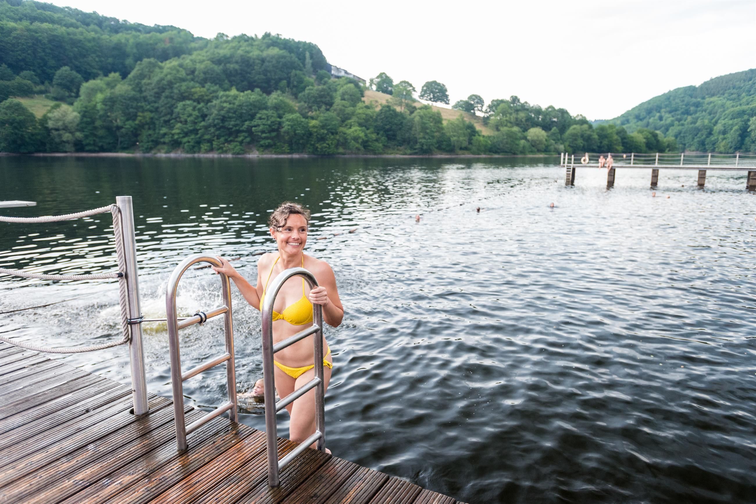 Mitten in der grünen Kulisse des Nationalparks Eifel am Obersee liegt das familienfreundliche Naturerlebnisbad Einruhr. Mit Liegewiese, Kiosk, Umkleiden, Schließfächern, Fitnessgeräten, Kinderspielplatz und Rutsche ist alles da, was man für einen unbeschwerten Badetag benötigt. Wer lieber übers Wasser schippert, kann sich auch ein Tret- oder ein Ruderboot leihen. Übrigens: Das Naturerlebnisbad kommt ganz ohne Chlor und Chemie aus. Das Wasser wird vollständig mikrobiologisch aufbereitet.