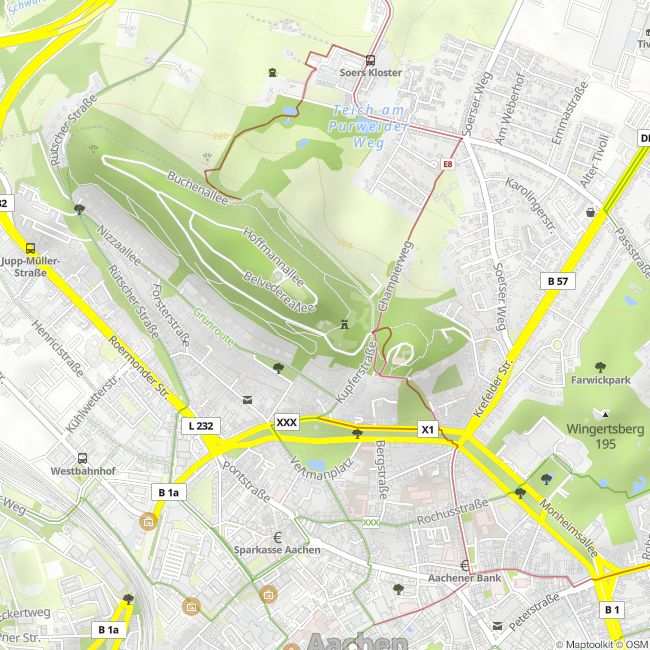 Ein himmlischer Ausblick eröffnet sich einem vom Gipfelplateau des Lousbergs über Aachen und seine Umgebung. Vom Soerser Tal über den Tivoli bis hin zum Aachener Wald und dem Beginn der Eifel kann man den Blick in die Ferne schweifen lassen. Genau das tat 1807 auch der Geograph Jean Joseph Tranchot und erfasste von hier aus die gesamte Region in einer Karte. Zu diesem Zweck und für weitere astronomische Beobachtungen wurde der große Obelisk aus Blaustein hier aufgestellt.