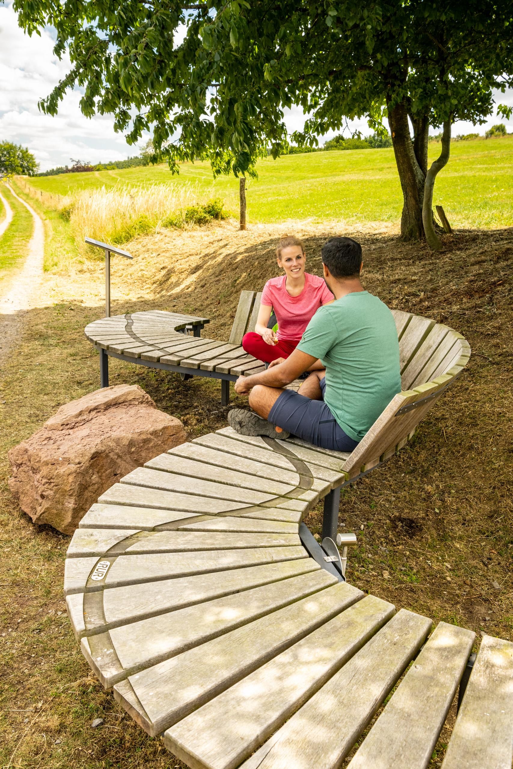 Die besondere Form der hier befindlichen Bank ist der mäandrierenden Rur nachempfunden, der exakte Flussverlauf ist auf der Bank ersichtlich und spiegelt die im Blickfeld liegende Landschaft wider. Eine weitere Besonderheit ist das Pendel an der Bank.