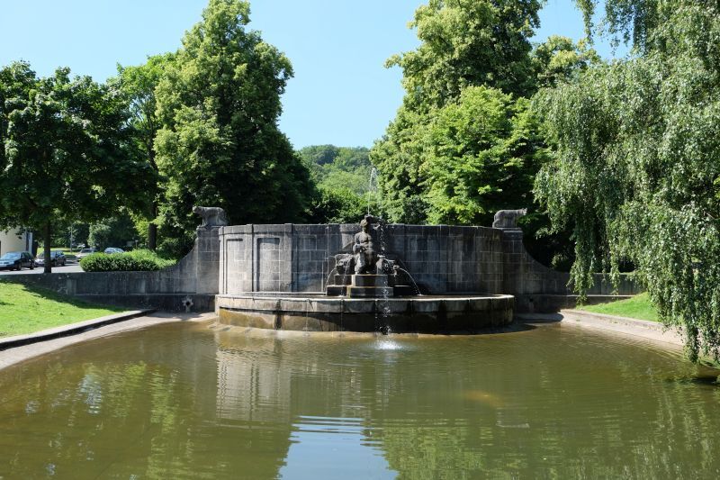 Der Tritonenbrunnen, ursprünglich für den Bahnhofsvorplatz konzipiert, wurde 1923 in die Kaiser-Friedrich-Allee verlegt. Der Brunnen, auch als Wassermann bekannt, zeigt den griechischen Meeresgott Triton. Von hier aus fließt das Wasser weiter zum Hangeweiher, was seine Bedeutung für die lokale Wasserführung unterstreicht.