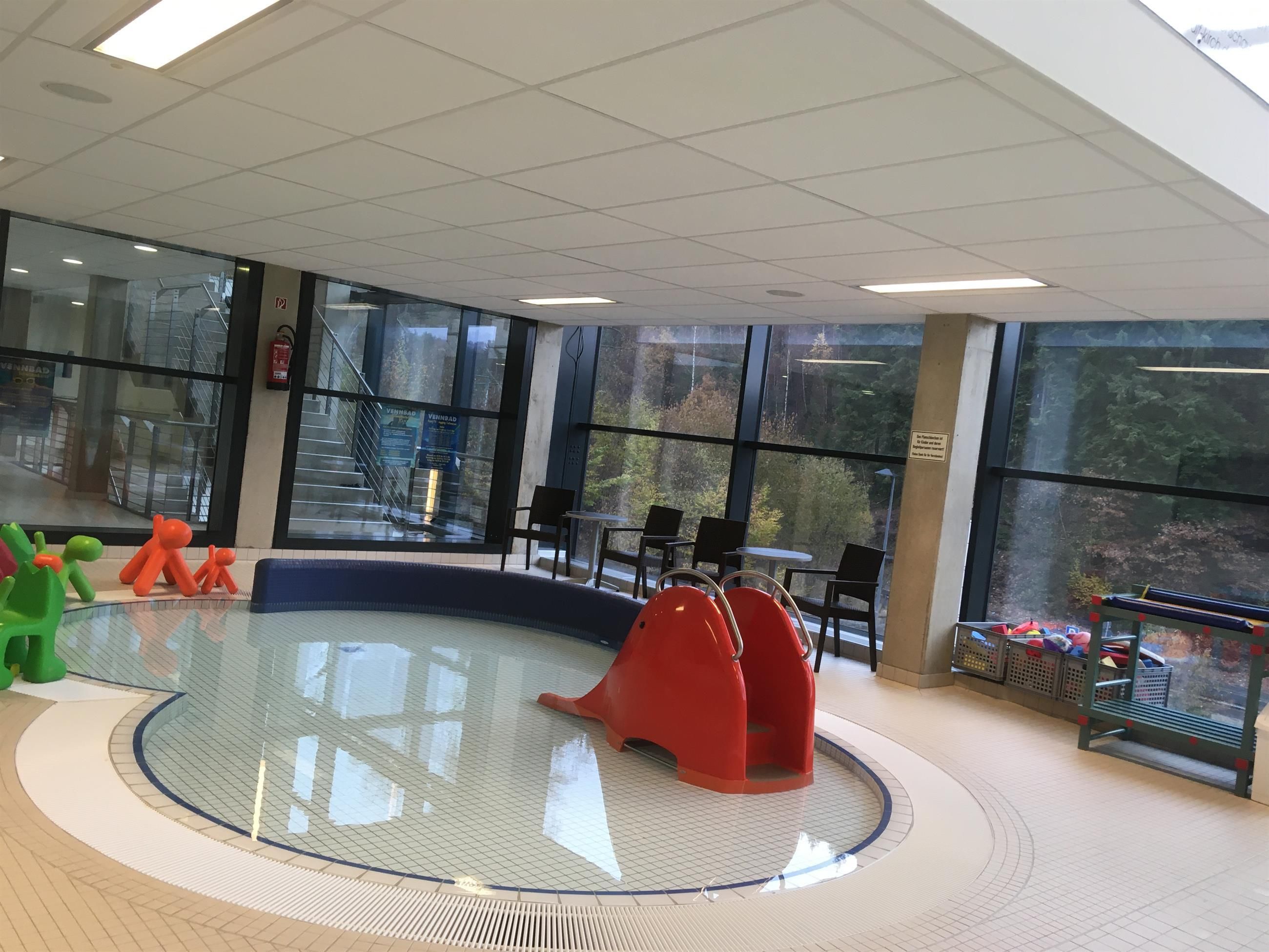 Bei 28,5 Grad Wassertemperatur bietet das 25 Meter-Becken mit Sprungbrett und Drei-Meter-Turm 4 Bahnen. Lehrschwimmbecken und Kinderbecken sind auch vorhanden.