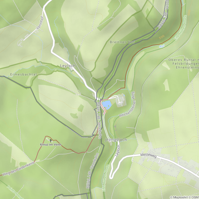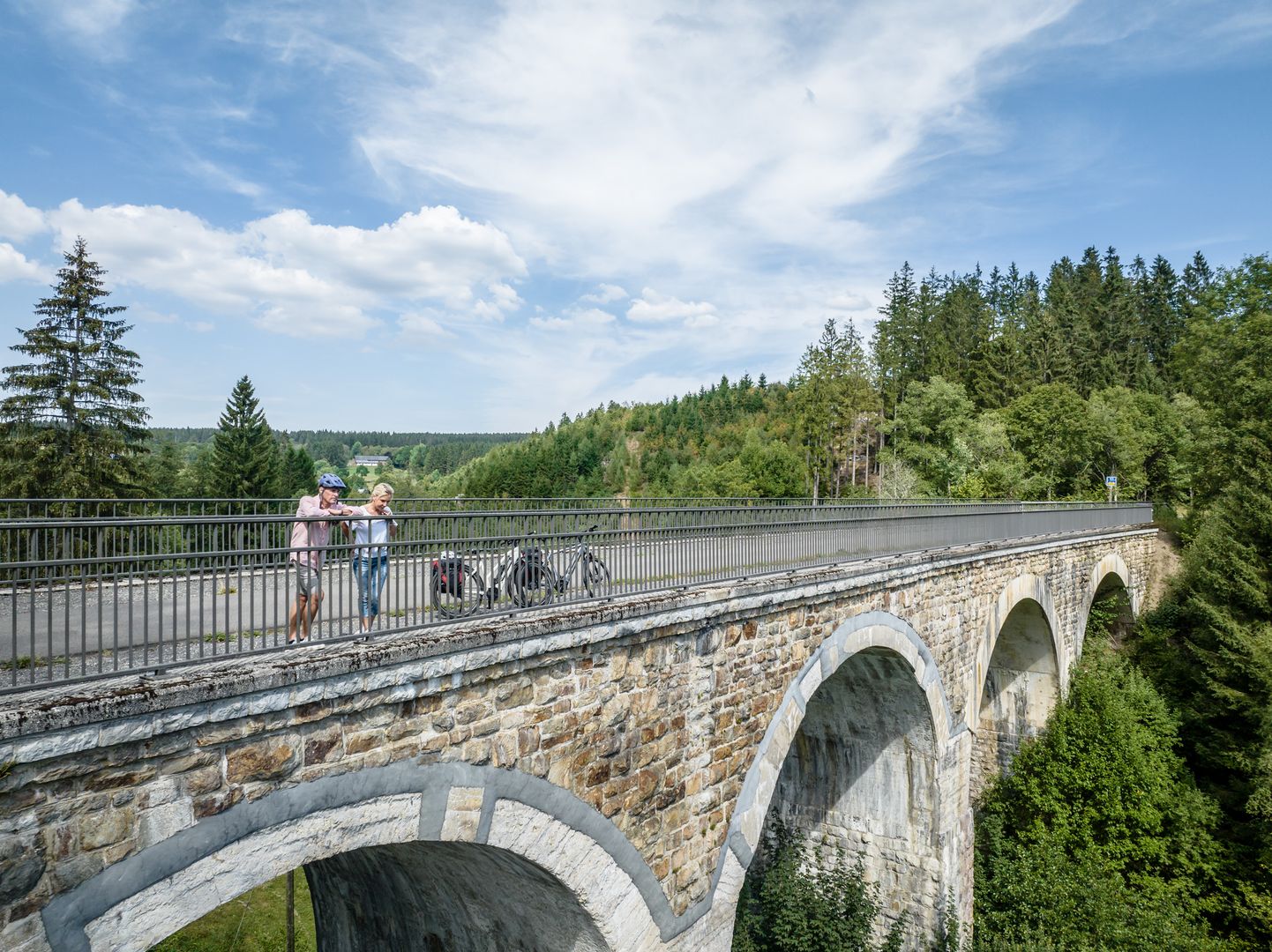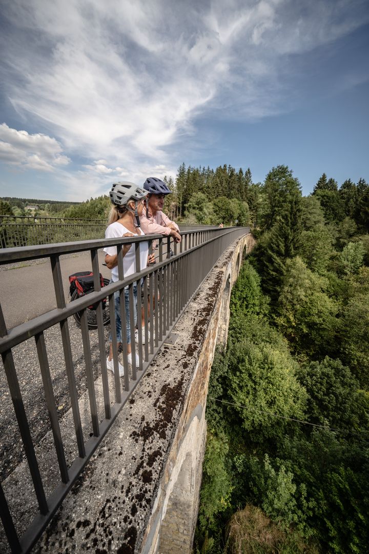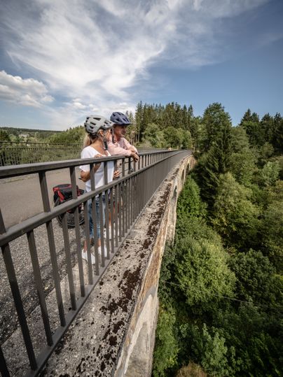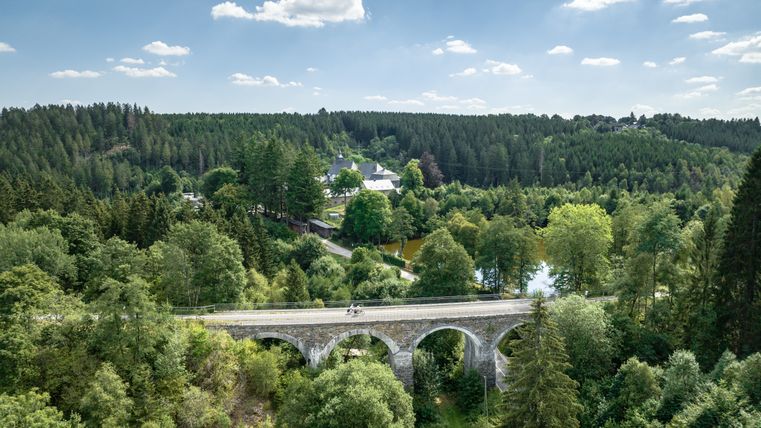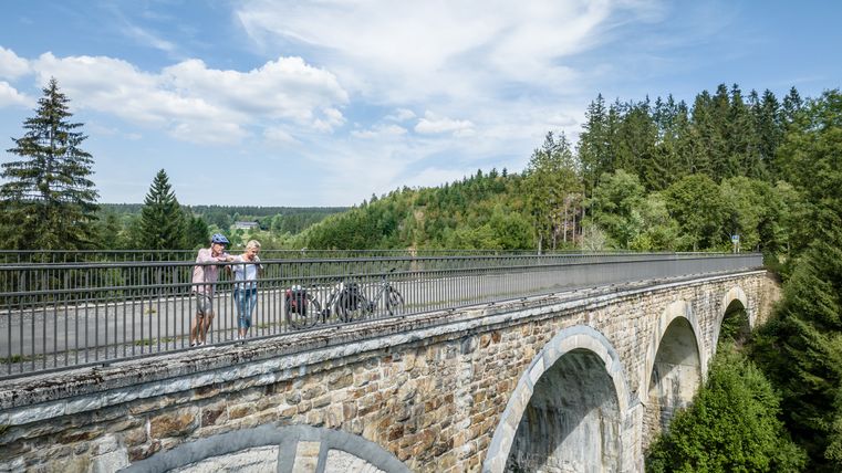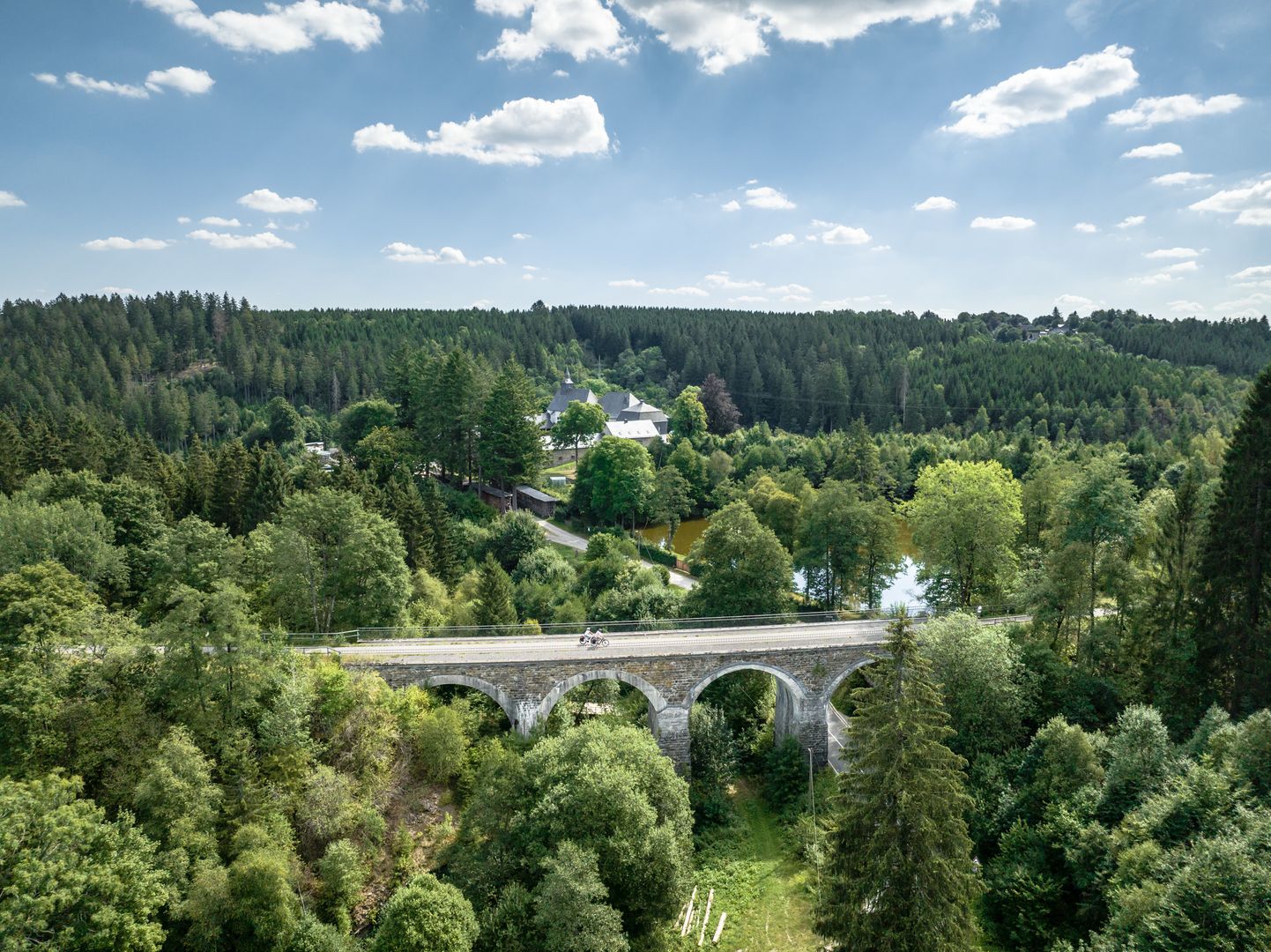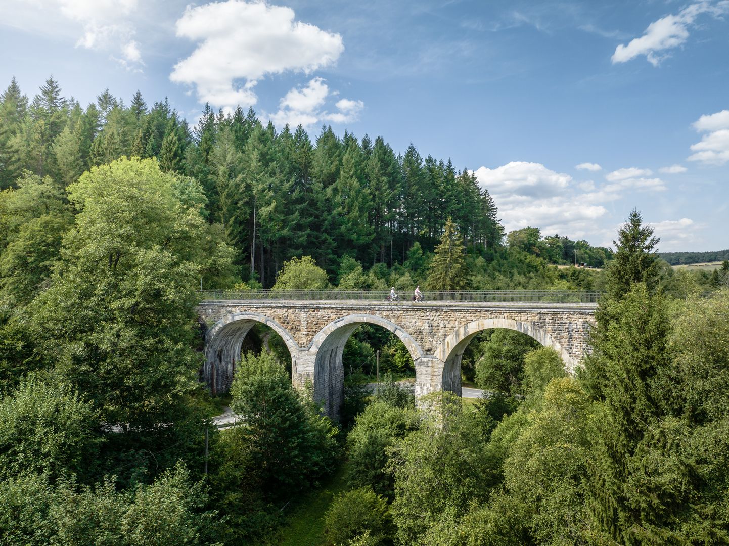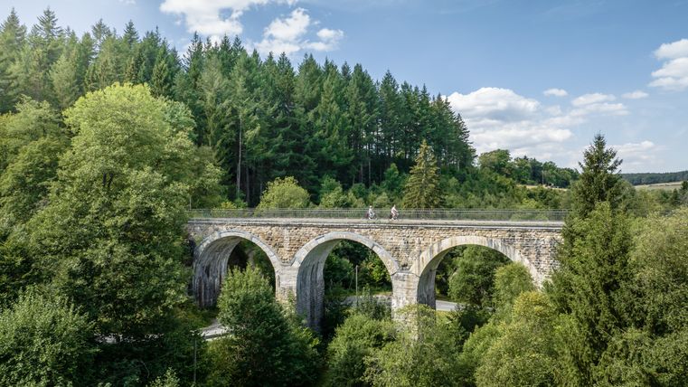 Als Teil der ehemaligen Vennbahnroute säumt das Viadukt noch heute die Landschaft. Unweit von Gut Reichenstein zeigt sich die ehemalige Eisenbahnbrücke majestätisch über der Straße, bevor sie links und rechts in den Wäldern verschwindet.