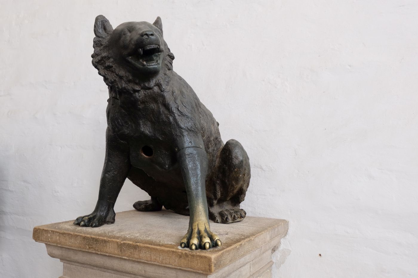 Der Wolf, der tatsächlich eine Bärin darstellt, stammt aus der Antike, während der Pinienzapfen vermutlich im 10. Jahrhundert gegossen wurde. Ursprünglich schmückte er einen Springbrunnen vor dem heutigen Aachener Dom. Beide Bronzefiguren sind durch die Dombaulegende miteinander verbunden, die ihre historische Bedeutung unterstreicht.