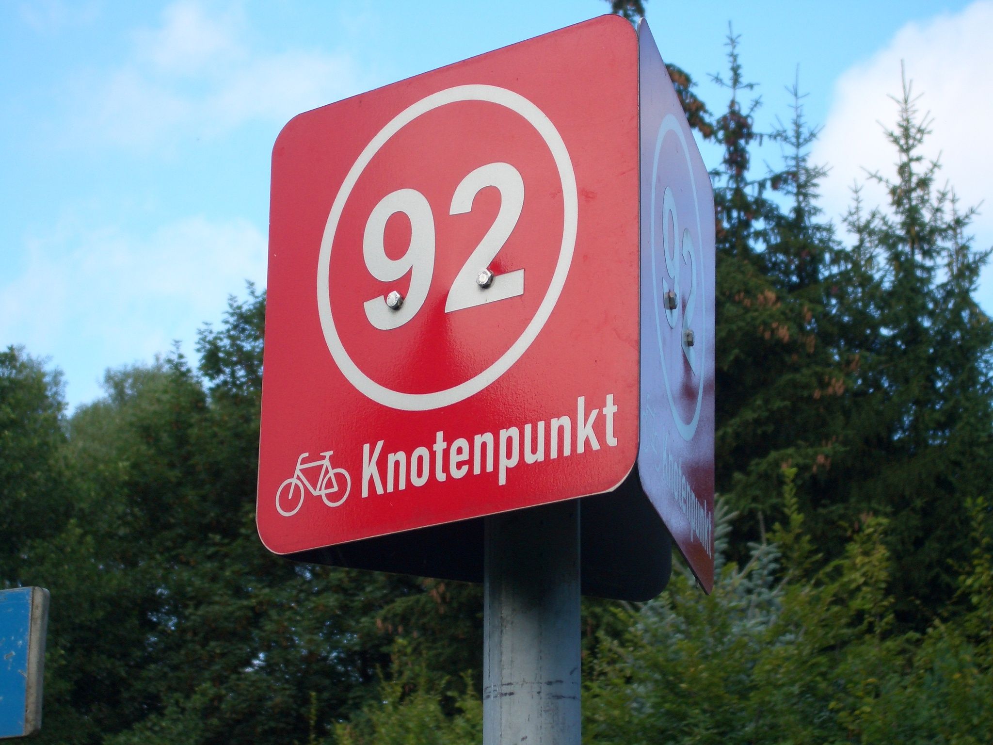 - Knotenpunkte: Ausgewählte Zielwegweiser an verschiedenen Schnittpunkten von Routen sind zusätzlich mit Nummern versehen und bilden die sog. Knotenpunkte. Auf den Verbindungsrouten zwischen den einzelnen Knotenpunkten werden die Nummern der benachbarten Knotenpunkte als Einschubschild mitgeführt. Als Orientierungshilfe befindet sich an jedem der Knotenpunkte zudem eine Übersichtskarte, auf der das Routennetz der näheren Umgebung abgebildet ist. Die Routenplanung wird durch das Knotenpunktsystem erheblich vereinfacht. Frei nach dem Motto „Radeln nach Zahlen“ suchen Sie sich einfach Ihre individuelle Route, notieren sich die Nummern der dazugehörigen Knotenpunkte und folgen dann den Einschubschildern in entsprechender Reihenfolge.