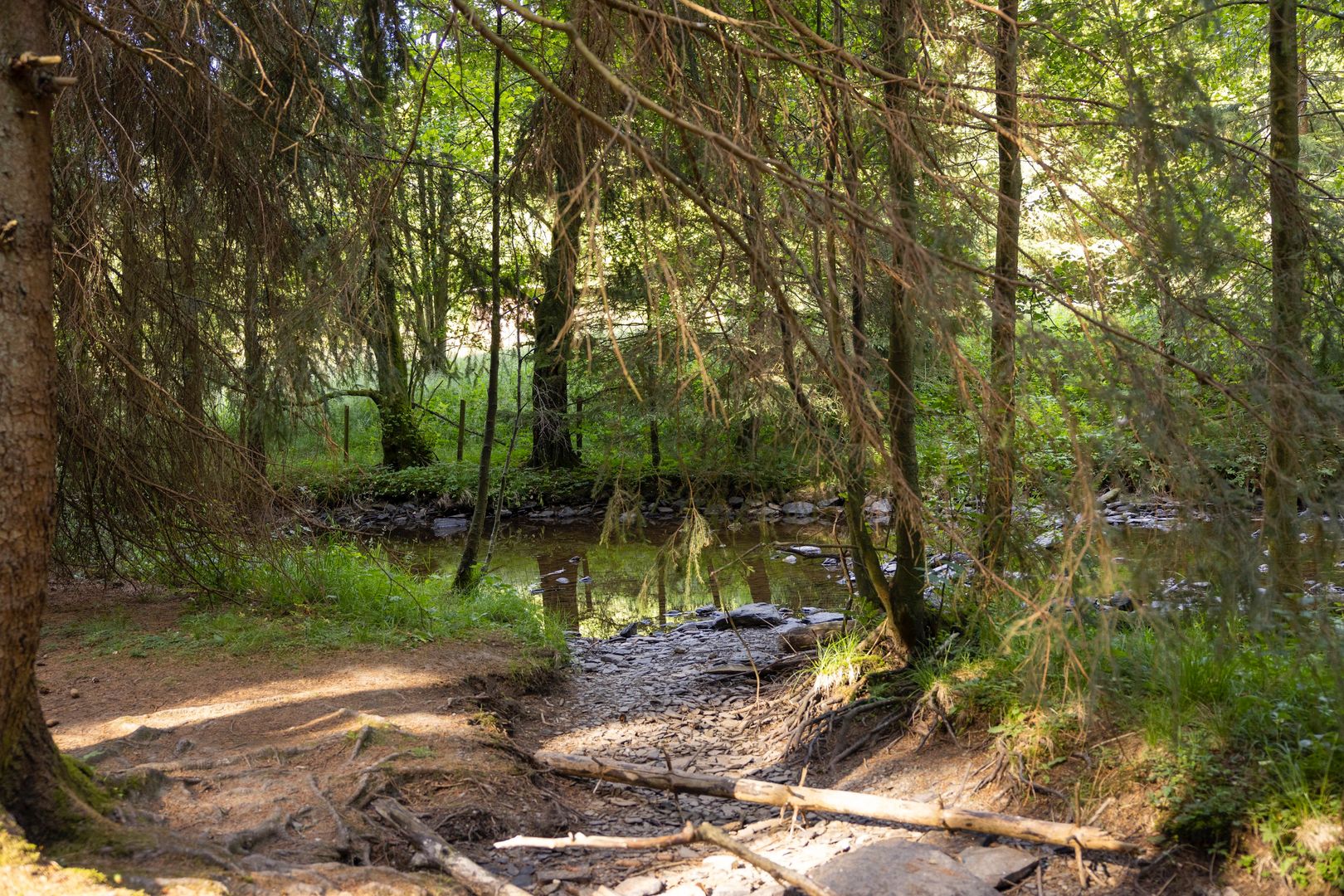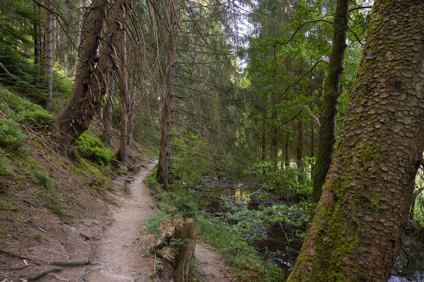 Bestens informiert kann man gleich hinter dem Nationalpark-Tor auf dem Wildnis-Trail* eine gemütliche Halbtages-Wandertour starten. Zuerst führt der Wanderweg entlang mächtiger Flurhecken abwärts in Richtung Perlenbach-Talsperre. Wenn man Glück hat, sieht man hier Bussarde und Habichte über das Offenland fliegen. Später folgt man dem Wildkatzenlogo auf dem Wegweiser-Schild nach links und gelangt auf einen tollen Wurzelpfad durch einen dichten Fichtenwald. Hier gibt es nicht nur einen Picknickplatz, sondern auch einen interessanten Wurzelpfad, auf dem man sich ganz prima hinter den Bäumen direkt am Wegesrand verstecken kann. Fast die ganze Zeit hört man den Perlbach vorbeiplätschern. An der Brücke zum Holländerhäuschen weist die Wildkatze dann links ab und man folgt dem Fuhrtsbachtal bis zur Antoniusbrücke. Das Tal gehört zu einem Naturschutzgebiet und ist genauso wie das benachbarte Perlenbachtal bekannt für die millionenfache Blüte der Wilden Narzissen im Frühjahr. Weiter geht es dann über Wald- und Wanderwege immer der Wildkatze nach in Richtung Wanderparkplatz Wahlerscheid; mit 632m der höchste Punkt auf dem Wildnis-Trail. Je nach Jahreszeit kann man in den romantischen Wiesentälern duftende Wildkräuter riechen und Schmetterling beobachten.