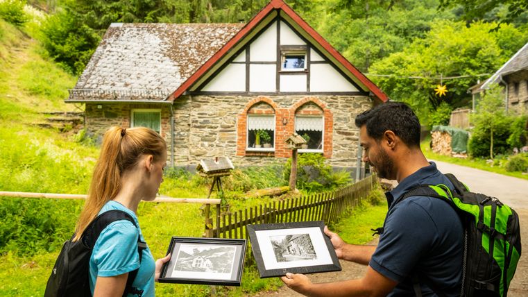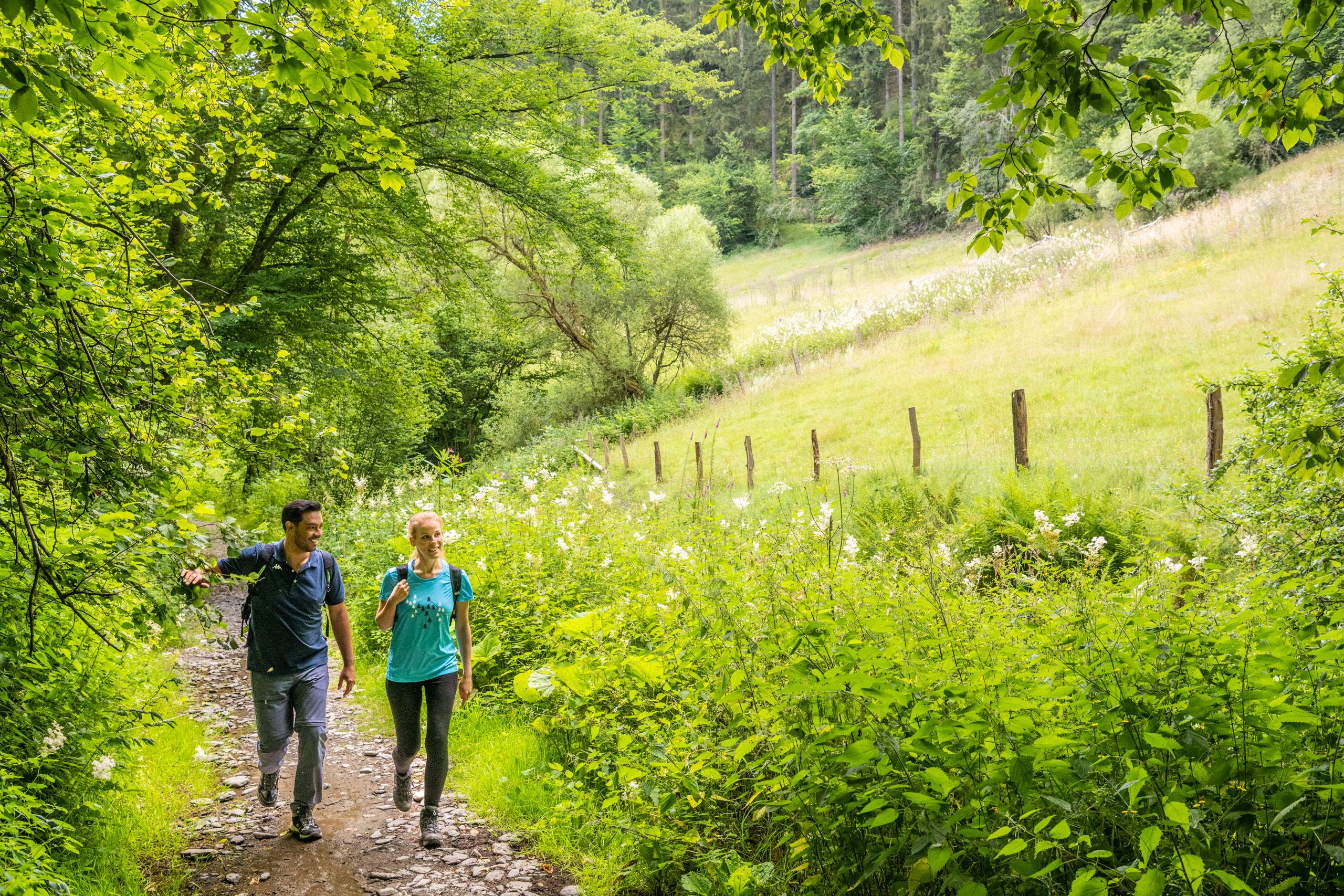 Die Eifeler Flurhecken und das reizvolle Tiefenbachtal. Durch den von Fachwerkhäusern geprägten Ortskern gelangt man entlang der ebenso für Eicherscheid typischen Flurhecken in das Tiefenbachtal. Der Weg schlängelt sich durch das idyllische Tal vorbei an der ehemaligen Ölmühle bis in das Rurtal. Von dort führt ein Anstieg zurück in den Ort.