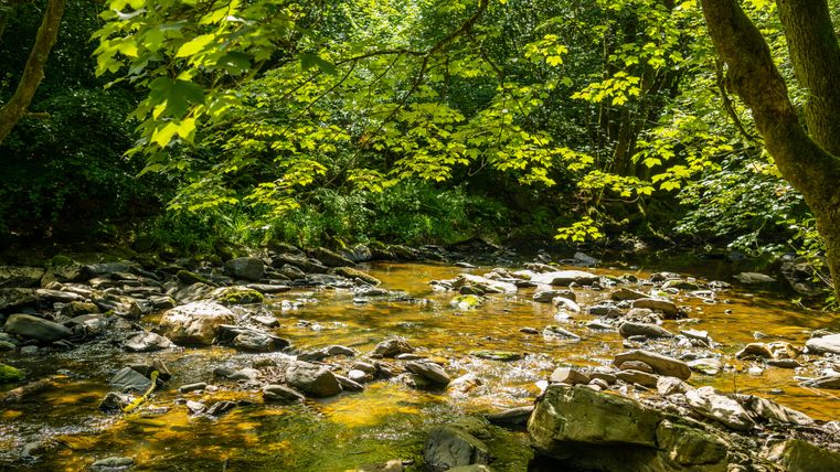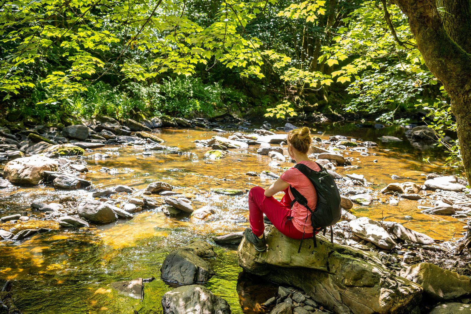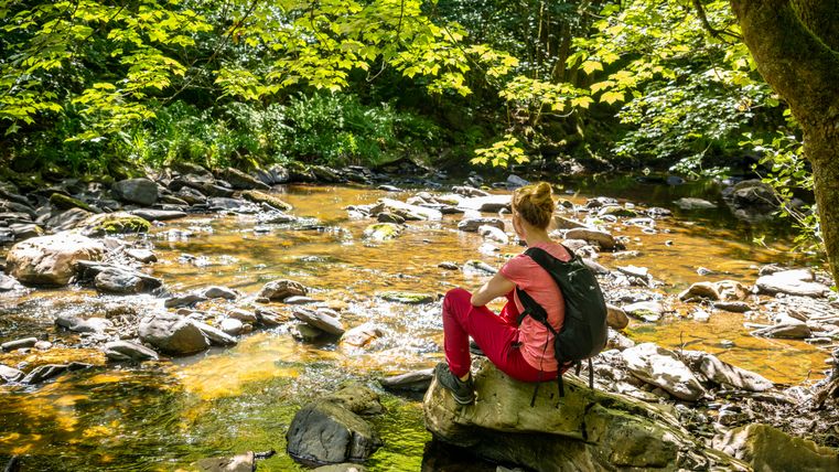 Natur pur und geschichtsträchtige Orte prägen den Wanderweg beiderseits der Rur. Vom Wanderparkplatz aus geht es zunächst zurück zu Straße. Auf der gegenüberliegenden Seite erinnern die Gebäude einer ehemaligen Reißwollfabrik an jene Zeit, als Monschau zu den Tuchmacherzentren Europas zählte. Das ehemalige Maschinenhaus beherbergt heute das Atelier eines Bildhauers.