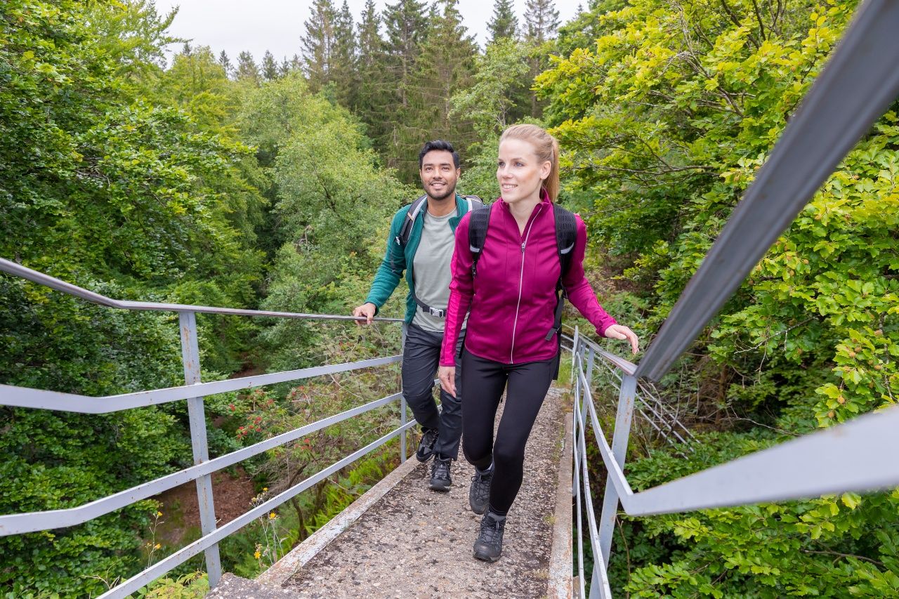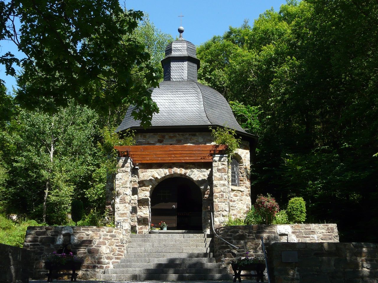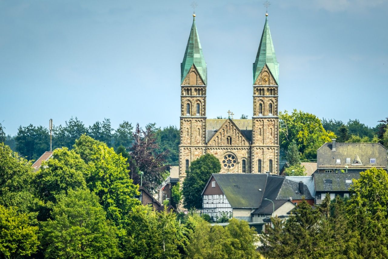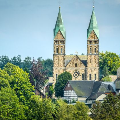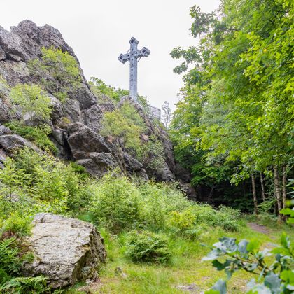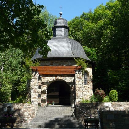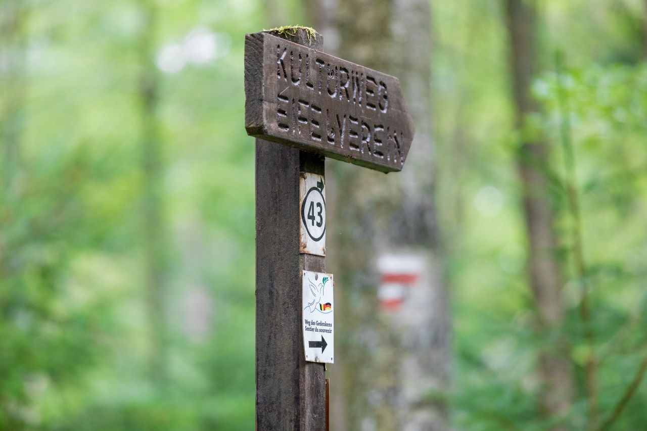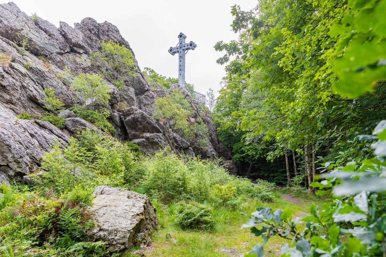 Durch das Tal des Ermesbaches, das von einer der imposantesten Brückenbauten der ehemaligen Vennbahn beherrscht wird, erreichen Sie die Rur. An mächtigen Felsformationen vorbei geht es zur 1926 eingeweihten Norbertuskapelle, die sich in unmittelbarer Nähe der Rurbrücke an den Hang schmiegt. Blumen und Kerzen zeigen, dass das Gotteshaus Ziel zahlreicher Menschen ist, die den heiligen Judas Thaddäus in schwierigen Lebenslagen um Hilfe anrufen. Jenseits der Straße beginnt die Rosengasse. Sie führt zunächst am renaturierten Talgrund vorbei, bevor sie in einen lichten Hangwald eintaucht. Nach etwa 650 Metern schließt sich in der Nähe der ehemaligen Vennbahnbrücke der Kreis und es geht zurück zum Ausgangspunkt am „Eifeldom“.