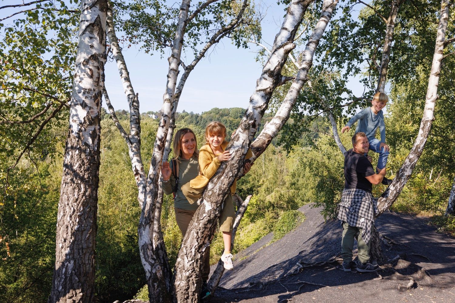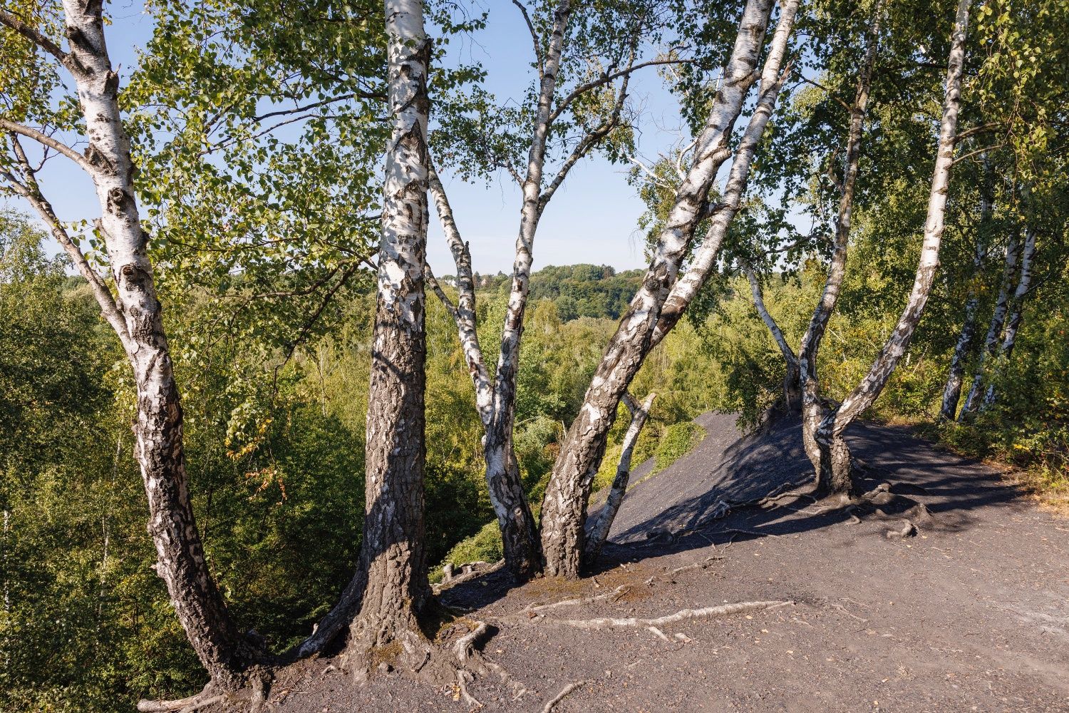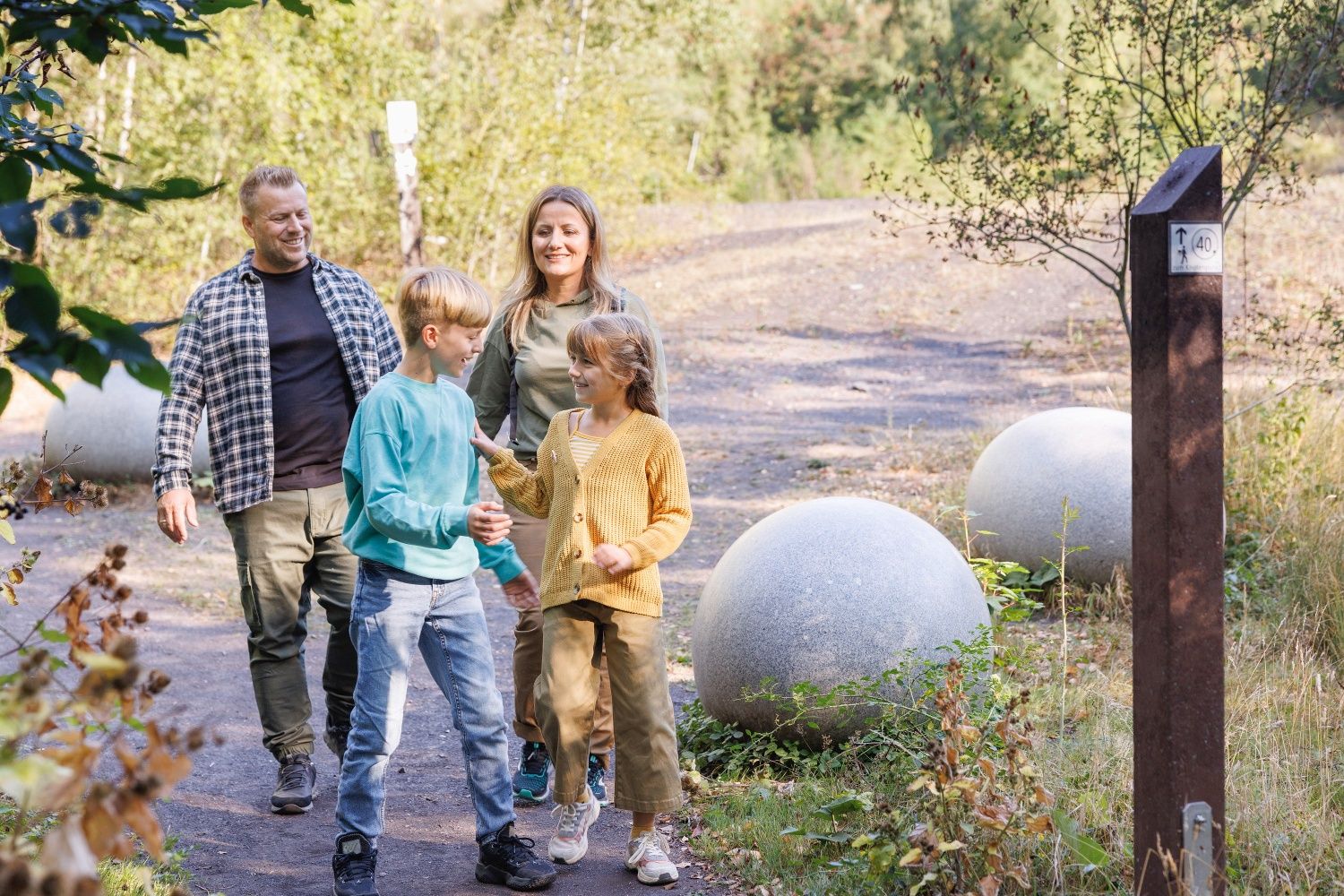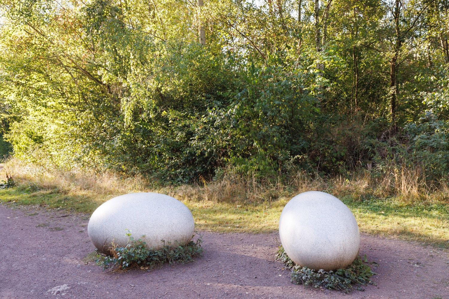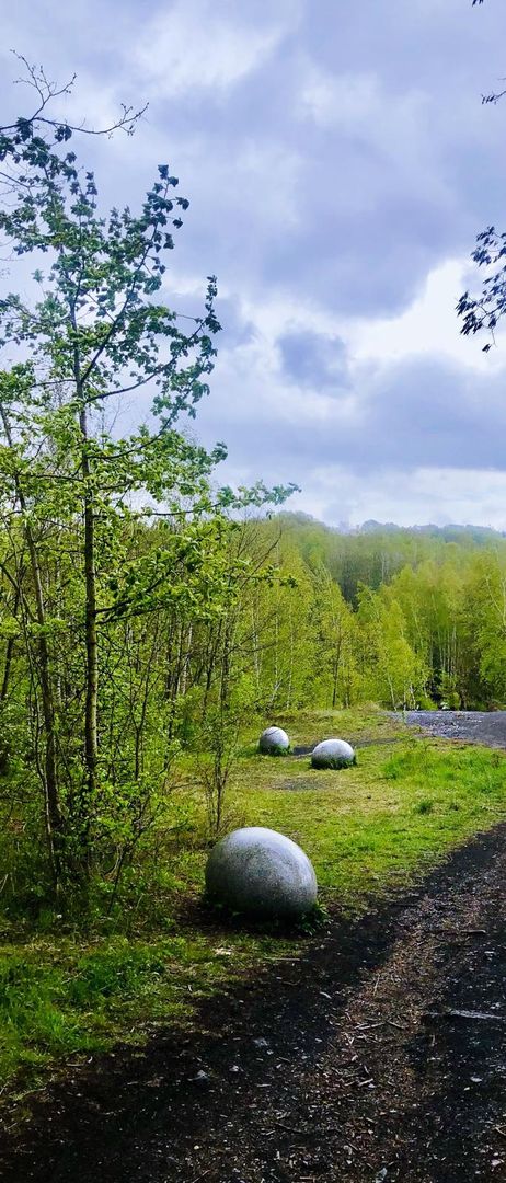 Gleich zu Beginn liegen riesenhafte weiße Steineier im Weg, kein Dinosauriergelege, sondern die Kunstinstallation „Black & White“. Sie erinnern an die bis 1929 aktive Sodafabrikation in Würselen. Auch deren Vermächtnis, eine bis zu 10 Meter mächtige Kalkhalde aus Rückständen der Fabrik, wirkt fast wie ein Alien im Wurmtal. Schwarzes finden wir hüben wie drüben an den Hängen des Flusses. Reine Natur, da die Kohle hier bis an die Erdoberfläche reicht. Vom menschlichen Wirken erzählen die bis heute sichtbaren laubbedeckten Schürfmulden, die wir im Wald entdecken können. Menschengemacht, da die Hänge den Kohleabraum aufnehmen mussten. Die Hochebene der schwarzen angeschütteten Halde Gouley erstreckt sich zu Füßen einer Aussichtsplattform, während die der Halde Langenberg auf der Kohlscheider Wurmseite versteckt im Grün von Wald und Volksgarten schlummert. Die Wurm ganz unten kümmert es wenig, geschützt darf sie durch ihre selbst geschaffene Auenlandschaft mäandrieren.