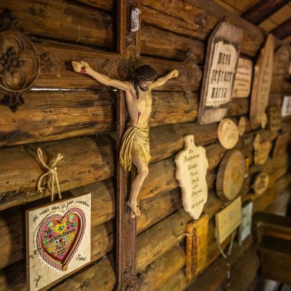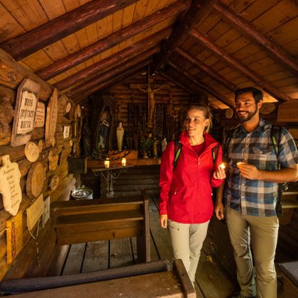 Am Waldrand folgen wir dem parallel zum Tal verlaufenden Kapellenweg. Immer wieder laden Bänke zu einer kurzen Rast ein. Die mit Liebe frisch renovierte Kapelle überrascht uns ein wenig. So einen geräumigen Bau haben wir hier wirklich nicht erwartet. Und uns wird rasch klar, dass nicht nur Wanderer wie wir den Weg zu diesem kleinen Gotteshaus finden. Wie die zahlreichen Votivtafelnzeigen, pilgern immer wieder Menschen hierher.