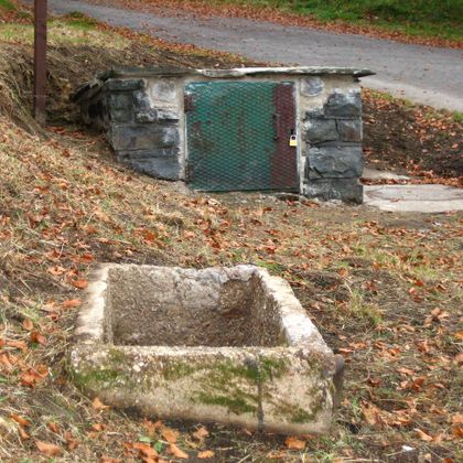 Wir überqueren den Schulweg und gelangen ins „Knippe-Jässje“. Früher war sie die wichtigste Verbindung zwischen der ehemaligen Kirchgasse, heute Arnoldystraße, und dem Mittelpunkt des Dorfes mit Gaststätten, Geschäften, Kirche und Friedhof. Ältere Einwohner erinnern sich noch gut an die Zeit, als hier noch keine Häuser standen. Den Kindern war es damals manchmal unheimlich, dort im Dunkeln entlangzugehen. An der Arnoldystraße stoßen wir auf einen mit Bruchsteinen eingefassten Trog. Vor der Restaurierung befand sich hier eine Viehtränke, an der die Kühe, wenn sie abends ins Dorf zurückgetrieben wurden, ihren Durst stillen konnten. Wir setzen unseren Weg durch das jüngste Neubaugebiet Kalterherbergs „In der Weide“ fort. Am Horizont entdecken wir die Pfarrkirche von Höfen. Hinter dem letzten Haus der Straße „Klüsenborn“ gelangen wir in die östliche Wiesenlandschaft mit einer weiten Quellmulde und den für Kalterherberg typischen Flurhecken aus Weißdorn. Es lohnt sich, immer wieder stehen zu bleiben und den Blick in alle Richtungen schweifen zu lassen. Vom Kalterherberger Eifelverein angebrachte Holzschilder geben die alten Flurnamen wieder. Gut, dass die Dorfrundgänge markiert sind! Ansonsten wäre es ein Leichtes, sich in dem weitläufigen Wegenetz zu verirren.