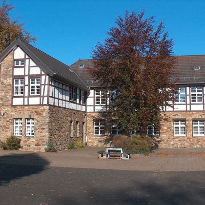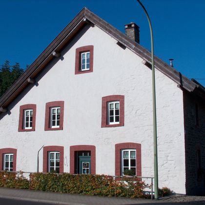 Vom Parkplatz aus gelangen wir zur Malmedyer Straße. Auch wenn die Neugierde recht groß ist, wollen wir die Pfarrkirche erst am Ende unseres Rundganges besichtigen. Durch eine sich zwischen Hecken hindurch windende schmale Straße kommen wir am ehemaligen Pfarrhaus und dem Friedhof vorbei zum weitläufigen Gebäudekomplex der Schule, die sich mit ihren Bruchsteinmauern und dem Fachwerk harmonisch ins Ortsbild einpasst.