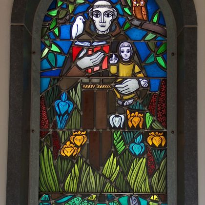 einem alten, denkmalgeschützten Fachwerkhof betreten wir das westliche Weideland. Beim Betrachten der Landschaft sollte man nicht vergessen, auch auf die Details am Wegesrand zu achten. Hierzu zählt der 2006 am Stamm einer Buche angebrachte Bildstock mit einer aus Polen stammenden Figur des hl. Franziskus, dem Beschützer der Tiere. Dort, wo ein vom Dorf kommender Asphaltweg unsere Route kreuzt, stoßen wir auf ein kleines Bauwerk aus Bruchstein mit einer Viehtränke: das „Schobbe Buersche“. Die Quelle, die sich darin verbirgt, lieferte früher selbst dann noch Wasser, wenn in niederschlagsarmen Zeiten die Hausbrunnen längst trocken gefallen waren. Nach etwa 550 Metern entdecken wir links vom Weg einen Gedenkstein. Er erinnert an Robert Christ, der bei einem Kalterherberger Bauern als Knecht arbeitete und am 1. Juli 1930 an dieser Stelle vom Blitz erschlagen wurde. Am Herrgottswinkel vorbei, der einen herrlichen Blick ins Rurtal beschert, erreichen wir eine dem heiligen Antonius von Padua geweihte Kapelle. Im Innern des 2006 errichteten kleinen Gotteshauses wartet ein besonderer Kunstgenuss auf uns. Das von dem in Hammer lebenden Künstler Erich Charlier entworfene Fenster begeistert durch leuchtende Farben und eine fröhliche, detailreiche Gestaltung. Über einen romantischen Feldweg erreichen wir den Parkplatz „Fedderbach“. Er ist ein Verkehrsknotenpunkt für zahlreiche Rad- und Fußwanderungen. Zahlreiche Hinweisschilder weisen darauf hin, dass es in der Umgebung von Kalterherberg manches zu entdecken gibt.