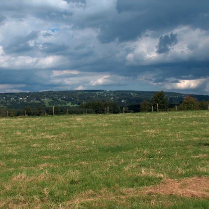 Nach Südwesten hin begrenzen in der Ferne hohe Fichten den Horizont. Doch die Stille, die uns umgibt, ist keine Selbstverständlichkeit. Manchmal übertönt das Donnern schwerer Geschütze den Gesang der Vögel und das Rauschen des Windes. Selbst die ältesten Einwohner Kalterherbergs kennen es nicht anders. Seit 1893 beginnt gleich hinter dem Waldrand der Truppenübungsplatz Elsenborn.