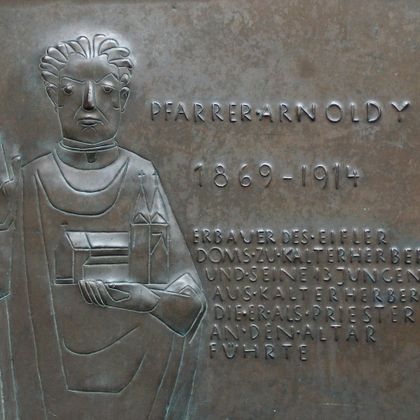 Von der Straße „Breitenberg“ aus gelangen wir zurück in die Ortsmitte. Bevor wir zur Kirche kommen, erleben wir auf nur wenigen Metern ein beeindruckendes Stück Kalterherberger Dorfgeschichte. Uralte und sorgfältig restaurierte Häuser stehen rechts und links der Straße. Fachwerkhöfe gibt es ebenso zu sehen wie frühe Steinhäuser, für die Kalterherberg weithin bekannt ist. Besonders geschichtsträchtig ist das zweigeschossige schieferverkleidete Gebäude mit der Hausnummer 11. In früheren Zeiten beherbergte es das Gasthaus Moll. Hier übernachtete die Schriftstellerin Clara Viebig, wenn sie sich zur „Sommerfrische“ in Kalterherberg Zuletzt wollen wir noch der von 1897 bis 1900 erbauten Pfarrkirche einen Besuch abstatten. Das Gotteshaus hat im Monschauer Land nicht seinesgleichen. Es ist das einzige, das im neuromanischen Stil errichtet wurde. Unverwechselbar ist die Kirche vor allem wegen der beiden 42 Meter hohen Türme, die ihr die Bezeichnung „Eifeldom“ eingebracht haben. Besonderes Glück war ihr im 2. Weltkrieg beschieden. Während zahlreiche andere Dorfkirchen in der Region zerschossen oder gesprengt wurden, blieb sie von Zerstörungen weitgehend verschont. Selbst die prächtigen alten, kunstvoll gearbeiteten Glasfenster im Chor mit Bildern aus dem Leben Jesu sind erhalten. Man sollte sich auf jeden Fall die Zeit nehmen, die 1958 eingesetzten Kirchenportale näher zu betrachten. Das Hauptportal zeigt Szenen aus dem neuen Testament. Über dem südlichen Seiteneingang erkennt man 11 der 14 Nothelfer. Die Tür der Sakristei ist dem überaus segensreichen Wirken von Pfarrer Arnoldy, dem Erbauer der Kirche, gewidmet. Ein Gegenstand im 1995 ausgemalten Innenraum erinnert an längst vergangene Zeiten. Der Taufstein mit der Jahreszahl 1688 stammt noch aus der Anfang des 16. Jahrhunderts erbauten Lambertuskapelle, die 1767 der ersten Kirche weichen musste.