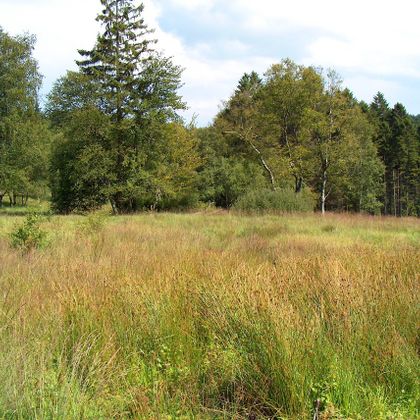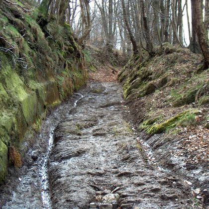 Der breite Feldweg führt uns schließlich direkt in eine andere Welt - den uralten Hohlweg. Hören Sie, wie die Bauern sich plagen und ihre Ochsen den steilen Berg vom Kelzerbach hinauf antreiben? Sie bringen Brennholz und Bruchsteine ins Dorf. Tiefer und tiefer grub sich der Weg in das Erdreich ein - an einigen Stellen bis zu drei Meter! Im harten Stein verewigten die eisenbeschlagenen Holzräder ihre Spuren. Der Abstieg endet in einer kleinen Idylle. Der Keltzerbach, der in die Kalltalsperre mündet, hat hier zwischen Bäumen sein Bett. Bei niedrigem Wasserstand geben große Steine den Weg auf die andere Seite frei. Nach der Überquerung und einer kleinen Steigung geht es auf gut befestigtem Weg weiter. In den nächsten Waldweg auf der rechten Seite biegen wir ein und stehen nach einigen Minuten im Venn.