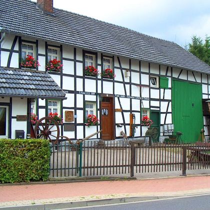 Wir machen uns auf den Weg zum Dorfkern. Einer der Gründe für Otto Junker, sich in Lammersdorf niederzulassen, war die Bahnstrecke, die durch den Ort führte. Auf dem ehemaligen Bahnhofsgelände könnte die alte Kastanie vielleicht von jenem hochfreudigen 30. Juni 1885 erzählen, als ganz Lammersdorf mit Girlanden und Gesang, Bier und Brötchen den ersten, festlich geschmückten Zug erwartete. Weniger Phantasie, sich die vergangenen Tage vorzustellen, bedarf es im Bauernmuseum gleich nebenan. Hier wird das Landleben des 19. und frühen 20. Jahrhunderts fast wieder lebendig. Das typische Eifeler Bauerngehöft beherbergt auf rund 600 Quadratmetern Ausstellungsfläche über 2000 Exponate aus dem Arbeits- und Familienalltag.