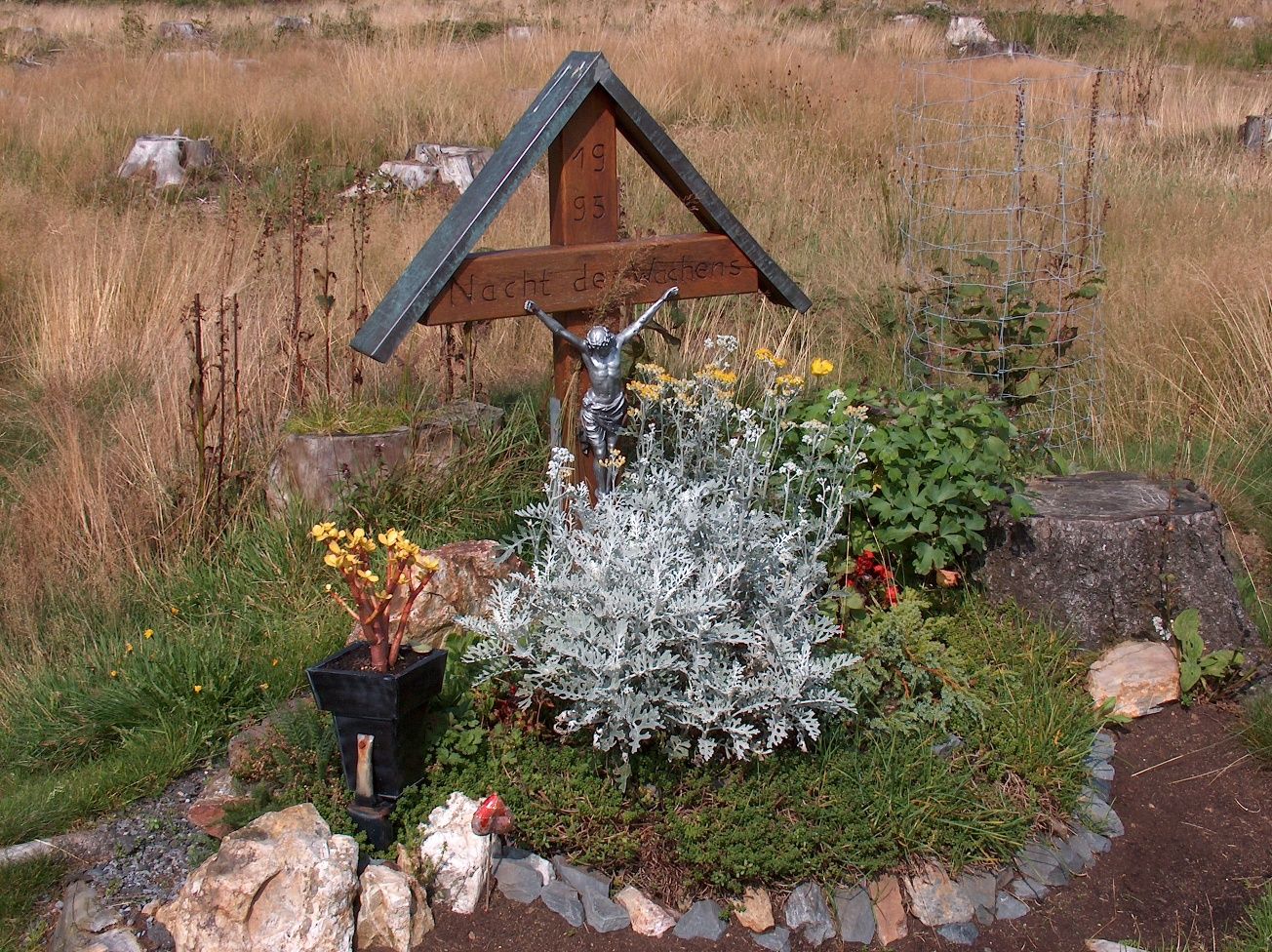 Die Straße „In den Stecken“ führt zum geographischen Höhepunkt unserer Wanderung. Bis dahin erleben wir die ganze Vielfalt des Ortsbildes. Nachdem wir einen landwirtschaftlichen Betrieb passiert haben, durchschreiten wir die Mützenicher Heckenlandschaft. Je weiter wir uns vom Dorf entfernen und je höher wir steigen, desto lichter werden die Flächen. Am Waldrand befinden wir uns auf dem Steling, mit 659 Metern die höchste Erhebung der StädteRegion Aachen. Neben einer privaten Wetterstation steht das „Gipfelkreuz“. Es ist das 1995 von der Dorfjugend errichtete „Kreuz des Wachens“. Jedes Jahr kommen am Gründonnerstag Mädchen und Jungen des Ortes hier zusammen, um einer alten christlichen Tradition folgend eine Nachtwache zu halten. Die besondere Attraktion des Stelings ist die grandiose Fernsicht. Nirgendwo sonst kann man im Monschauer Land so weit blicken!