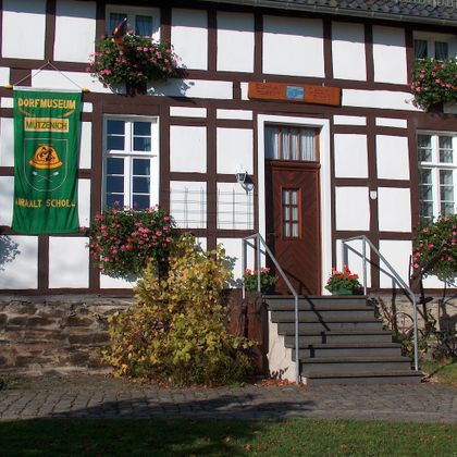 Wir beginnen unseren Rundgang gleich mit einer Besonderheit. Drei „Schulgenerationen“ sind in der Nähe des Parkplatzes auf engstem Raume versammelt. Die beiden älteren Gebäude scheinen ihr Aussehen kaum verändert zu haben. Das ist nicht zuletzt das Verdienst der Mützenicher Bevölkerung und der Vereine, die 1998 mit großem ehrenamtlichem Einsatz den Mittelpunkt ihres Dorfes neu gestaltet haben. Das erste, in Fachwerkbauweise auf einem Bruchsteinfundament errichtete Schulgebäude aus dem 19. Jahrhundert mit den alten Sprossenfenstern und dem mit Schiefer verkleideten Giebel ist ein wahres Schmuckstück. Heute befindet sich hier das vom Heimatverein betriebene Dorfmuseum mit dem treffenden Namen „Uraalt Scholl“. Die Ausstellung kann nach vorheriger Anmeldung besichtigt werden. Der Nachfolgebau, die „Aalt Scholl“, steht links daneben. Sie wird als Vereinshaus genutzt. Nach rechts schließt sich die heutige Grundschule an.
