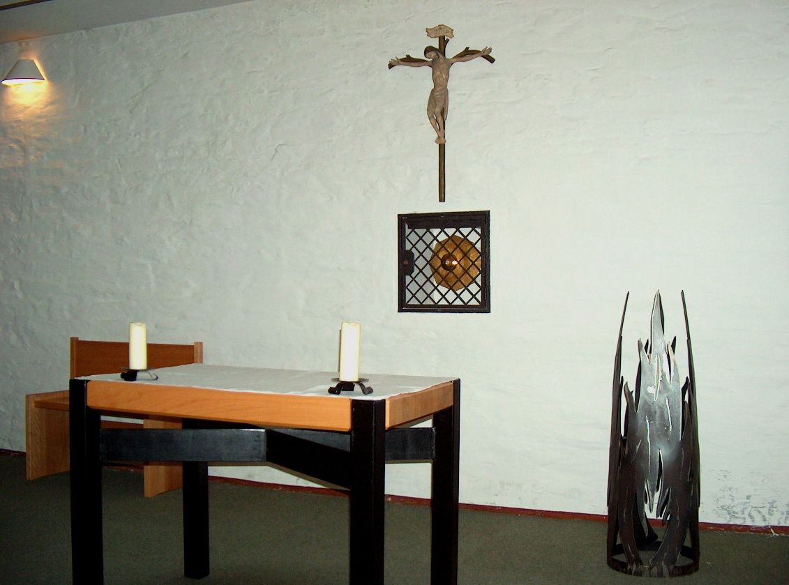 Rechts vom Chor führt eine Treppe hinab. Nachdem wir den Lichtschalter betätigt haben, steigen wir hinunter in die Krypta. Wir betreten einen geradezu mystischen Raum. In einer Nische hinter dem Altar befindet sich da sGefäß mit einer Reliquie der seligen Schwester Helena Stollenwerk. Die Nische in der gegenüberliegenden Wand beherbergt eine alte Pieta.