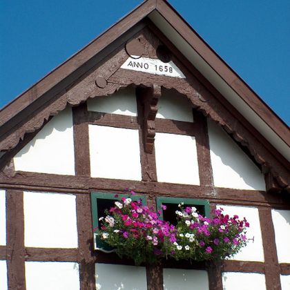 In der Äuchesgasse tauchen wir in eine romantische Dorfwelt ein. Leicht schlängelt sich die schmale Straße dahin, gesäumt von mächtigen Buchen, knorrigen Hecken und alten Fachwerkhäusern. Nach links bietet sich uns ein herrlicher Blick über die Wiesen auf den Nachbarort Strauch. Wir gelangen nun erneut in die Streinrötschstraße. Dort, wo sie nach rechts abbiegt, stoßen wir in der Außenmauer eines Bauernhofes auf ein efeuumranktes Wegekreuz. Kurz darauf treffen wir auf ein Fachwerkhaus mit einem herrlichen Blumengarten. Es ist das älteste Gebäude Rollesbroichs. Eine Inschrift im Giebel erinnert an seine Erbauung im Jahre 1658.