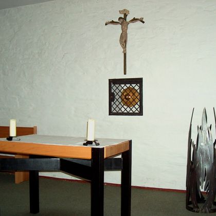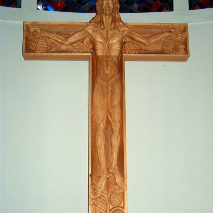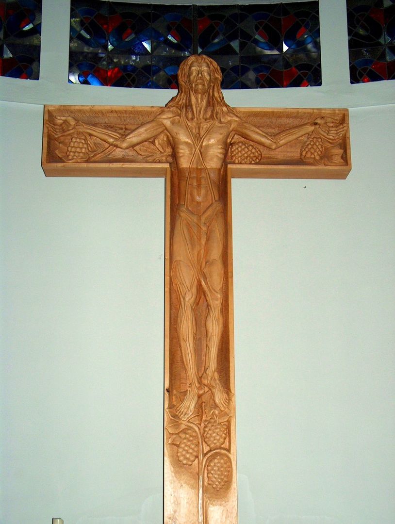 Bis zur Pfarrkirche, die von 1952 bis 1954 auf den Ruinen des im Krieg zerstörten Vorgängerbaues errichtet wurde, ist es jetzt nicht mehr weit. Sobald wir die Kirchebetreten, sind wir zunächst über die ungewöhnliche Gestalt des Innenraumes erstaunt. Es ist das Werk von Pfarrer Otto Voss, dem wir bereits zu Beginn unserer Tour begegnet sind. Wegen seiner für die damalige Zeit ungewöhnlich modernen Vorstellungen hatte er zwar einiges an Überzeugungsarbeit zu leisten, doch letztlich konnte er seine Pläne durchsetzen. Gleich beim ersten Blick in den Chorraum fällt uns das ungewöhnliche Kreuz auf, das ebenso wie Ambo und Tabernakel aus dem Atelier des Vossenacker Franziskanerpater sLaurentius U. Englisch stammt. Jesus, noch mit den Fesseln des Todes im Kreuzesgrab gebunden,schaut mit offenen Augen und ausgebreiteten Augen auf uns herab. Hier begegnet uns nicht der gestorbene, sondern der auferstandene Herr im Symbol des Weinstocks.