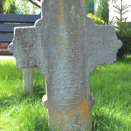 Vorbei an gepflegten Grundstücken gelangen wir zur Steinrötschstraße, der wir nach links folgen. Dort, wo die Äuchesgasse einmündet, befand sich in alter Zeit ein Dorfweiher, der für die Kinder ein beliebter Spielort gewesen ist. Der kleinen Margreta Hermanns wurde das jedoch zum Verhängnis. Im Jahr 1696 fand sie hier den Tod. Ein altes Steinkreuz mit einer ungewöhnlichen Totenkopfdarstellung hält noch heute die Erinnerung an sie wach.