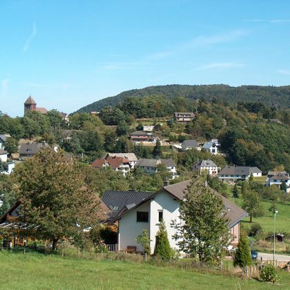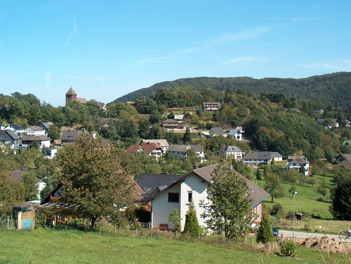 Hinter dem letzten Gehöft mit dem ehemaligen Backhaus an der linken Straßenseite gelangen wir in das Neubaugebiet „An der Eiche“. Hier wartet auf uns eine Sehenswürdigkeit ganz anderer Art: die Aussicht auf den See mit dem dahinter liegenden Kermeter und auf den südlichen Teil des Ortes mit der Kirche, die hoch oberhalb des Tales auf einem Sattel thront. Hier können wir uns davon überzeugen, dass Rurberg seinen Namen völlig zu Recht trägt.