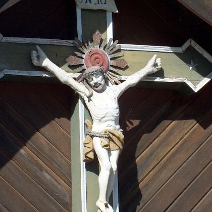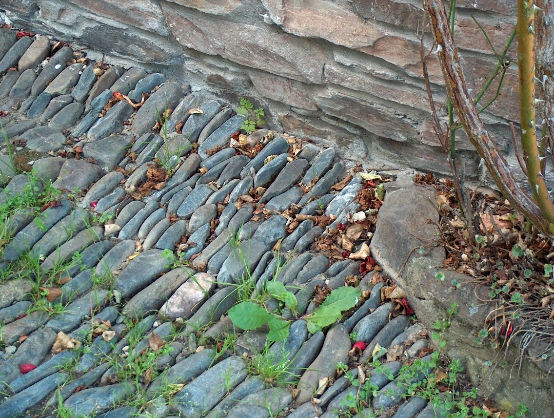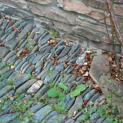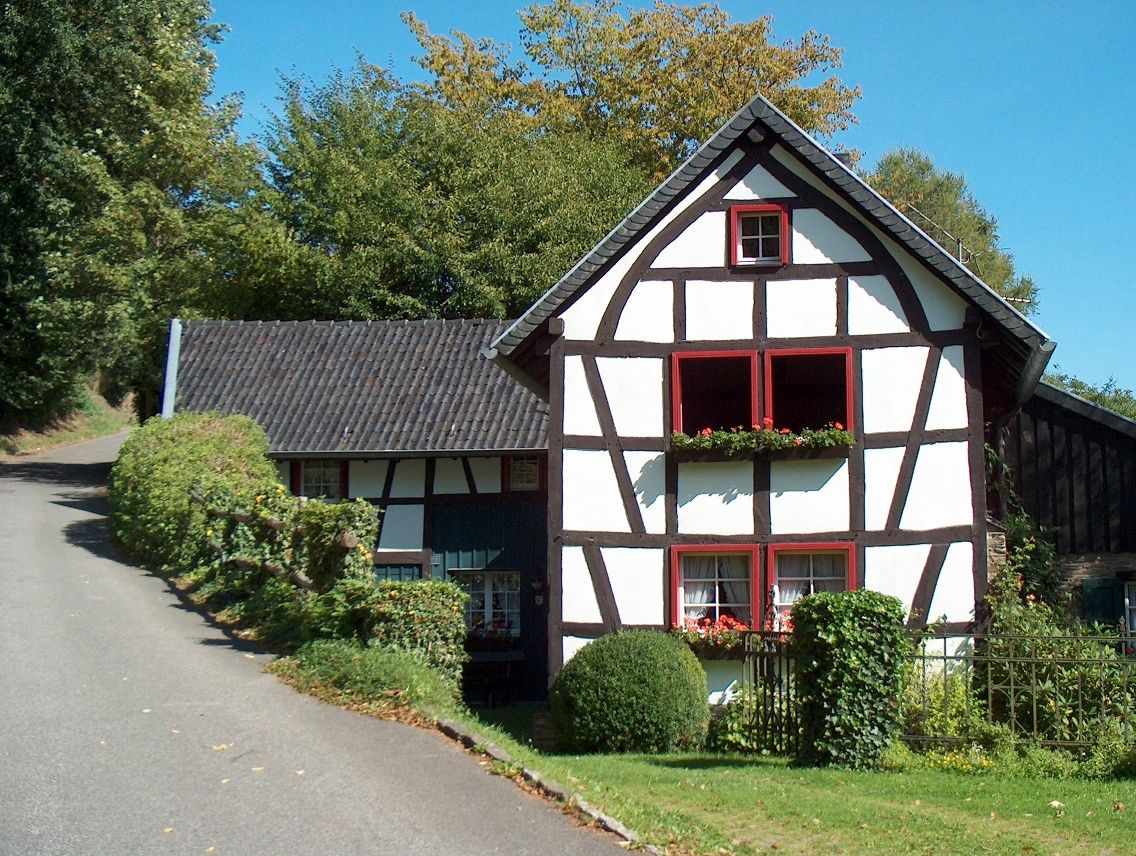 Erneut treffen wir auf zum Teil über dreihundert Jahre alte Fachwerkhäuser. Eine weitere Besonderheit von Alt-Rurberg sind die zahlreichen Kreuze, die von der tiefen Gottverbundenheit der Bevölkerung zeugen. Ihnen begegnen wir im Laufe unserer Wanderung immer wieder. Ein besonders schönes, farbig gestaltetesE xemplar mit einer Sonnenscheibe über dem Haupt des Gekreuzigten steht an dem Eckhaus oberhalb der Einmündung der Straße „Am Kanal“. Der „Bollard“ überrascht uns ebenfalls mit sehenswerten Gehöften. Eine Besonderheit der Rurberger Fachwerkhäuser entdecken wir bei einem kurzen Abstecher zu einem Haus in der „Ginstersley“. Hier ist das alte Hofpflaster aus Rurkieselsteinen erhalten geblieben.