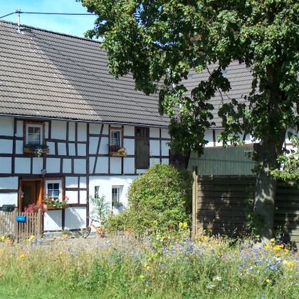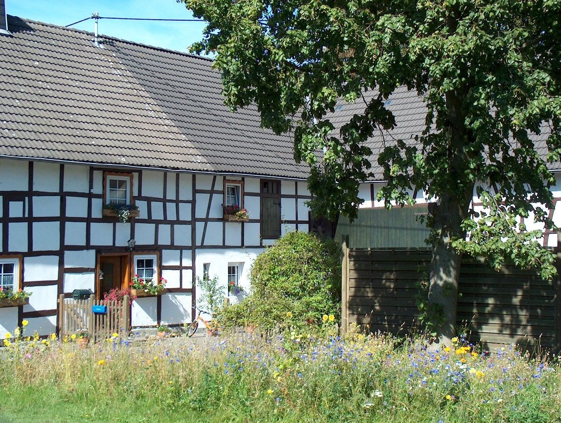 Gleich neben unserem Parkplatz erhebt sich die 1951 eingeweihte Pfarrkirche St. Matthias, die wir uns bis zuletzt aufsparen. Am Ende der „Kesternicher Straße“ biegen wir in die von Birken gesäumte „Sonnenstraße“ ein. Vor dem Sportplatz wenden wir uns nach links. Die zahlreichen schmucken Häuser in diesem Neubaugebiet zeigen, dass Strauch ein moderner Ort ist, indem es sich gut leben lässt. Durch „Sonnenstraße“ und „Zum Heister“ gelangen wir zur „Kölner Straße“. Das alte, denkmalgeschützte Fachwerkhaus auf der gegenüberliegendenStraßenseite versetzt uns gleich wieder in alte Zeiten zurück.