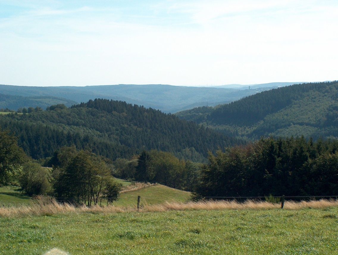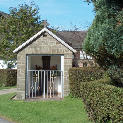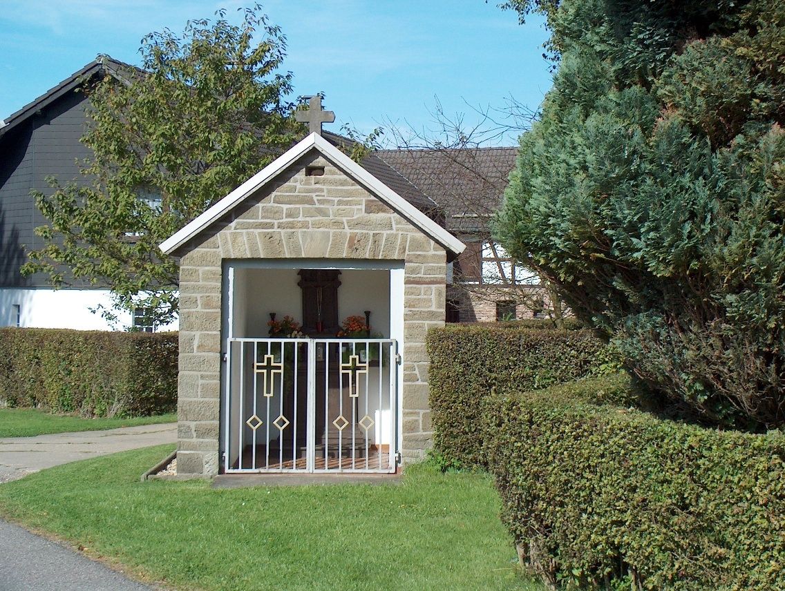 Bei nächster Gelegenheit biegen wir links ab und gelangen am Friedhof vorbei wieder zur Kirche. Gleich neben dem Parkplatz liegt ein weitläufiger Spielplatz, den die Kindern gewiss längst entdeckt haben. Man kann den Dorfrundgang an dieser Stelle bereits beenden. Doch Vorsicht! Wer den Weg nicht fortsetzt, der verpasst die wohl schönsten Aussichten, die dieser Dorfrundgang zu bieten hat! Wir folgen daher der „Kesternicher Straße“, nicht ohne an der liebevoll gepflegten Kapelle kurz Halt zu machen. Über die „Steckenborner Straße“ gelangen wir am Ortsrand zu einem Wirtschaftsweg, der uns nach rechts in die weitläufige Wiesenlandschaft führt. Am Ende des Weges bleiben wir fasziniert stehen. Unser Blick folgt dem Tal des Weidenbaches bis ins Rurtal. Dahinter erhebt sich der dicht bewaldete Kermeter. Rechts davon ragt der Turm der ehemaligen NS-Ordensburg Vogelsang empor. Weiter rechts markieren die Höhen des Nationalparks Eifel und der Ort Dreiborn mit seinem weithin sichtbaren Kirchturm den Horizont.