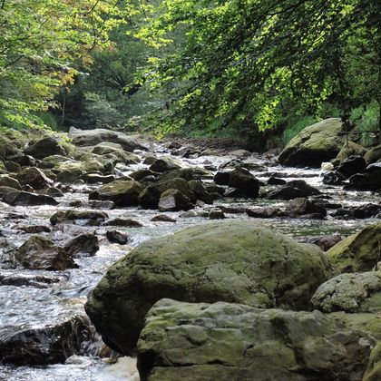 Die Farben vermischen sich mit der bunten Herbstpalette. Die Wanderung führt flussaufwärts und mit jedem Schritt wird der Wasserlauf wilder. Der Weg verengt sich zu einem Pfad und wird immer schmaler bis Sie sich am Geländer festhalten müssen, um den Hügel zu erklimmen! Die Aussicht ist prächtig.