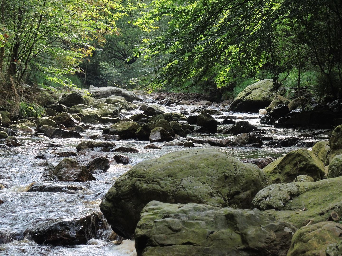 Die riesigen Buchenstämme weisen uns den Weg. Zu Beginn der Wanderung folgen wir einem hübschen Weg, der sich launisch am Berghang entlang schlängelt. In der Talmulde fließt die Hill und führt das rot-schwarze Wasser, das ihr das Venn mitgegeben hat.
