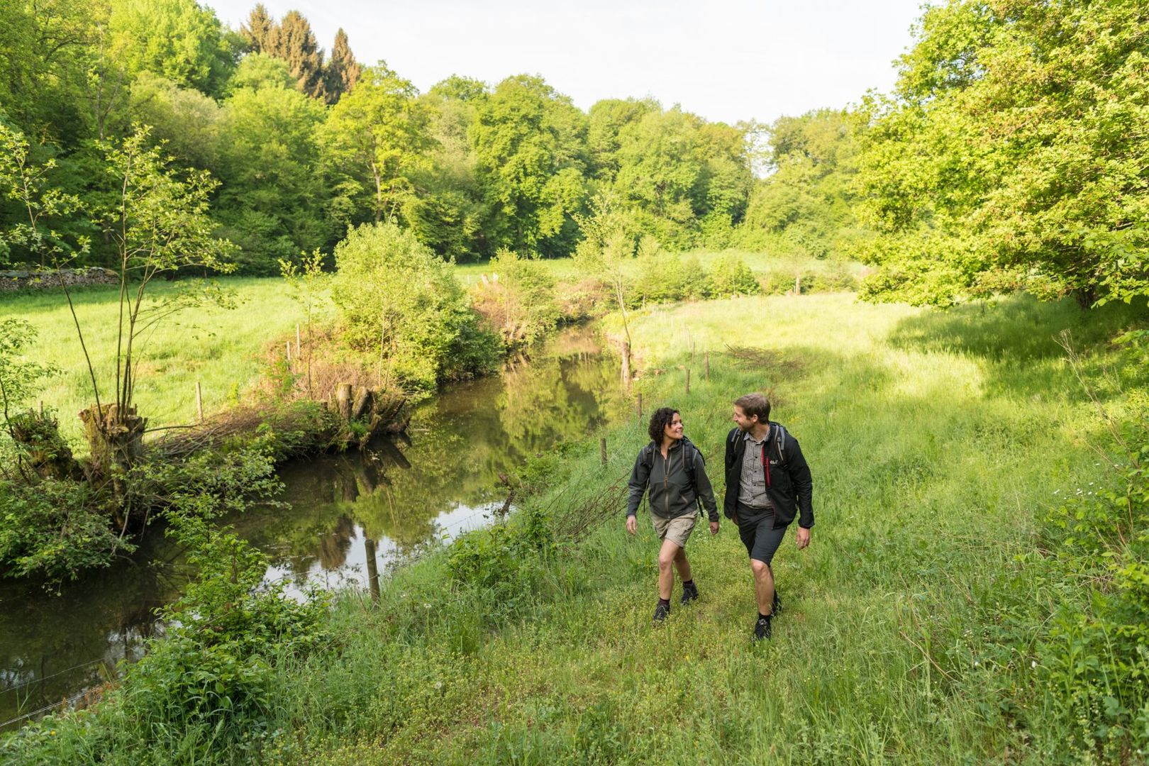 Du startest Deine Eifelsteig-Wanderung heute in der beschaulichen Ruhe des Klosters Himmerod. Gleich hinter dem Kloster erwartet Dich Dein ständiger Begleiter auf dieser Etappe: das kleine Flüsschen Salm schlängelt sich ruhig und idyllisch durch grüne Wiesen und urige Wälder. Heute kannst Du etwas durchatmen und entspannen - es geht eher flach mit nur wenigen Steigungen auf dem kurvigen Weg durch die grüne Naturlandschaft der Eifel. Historische Mühlen am Wegesrand entführen Dich in vergangene Zeiten. Dein Blick schweift über die Salm und saftige Wiesen und bleibt an steilen Felsformationen hängen. Die grauen Schichten von Schiefer biegen und falten sich vor Dir. Welche Motive formt Deine Fantasie in den Fels?