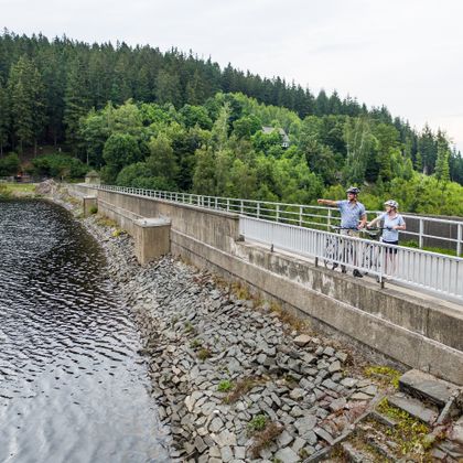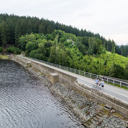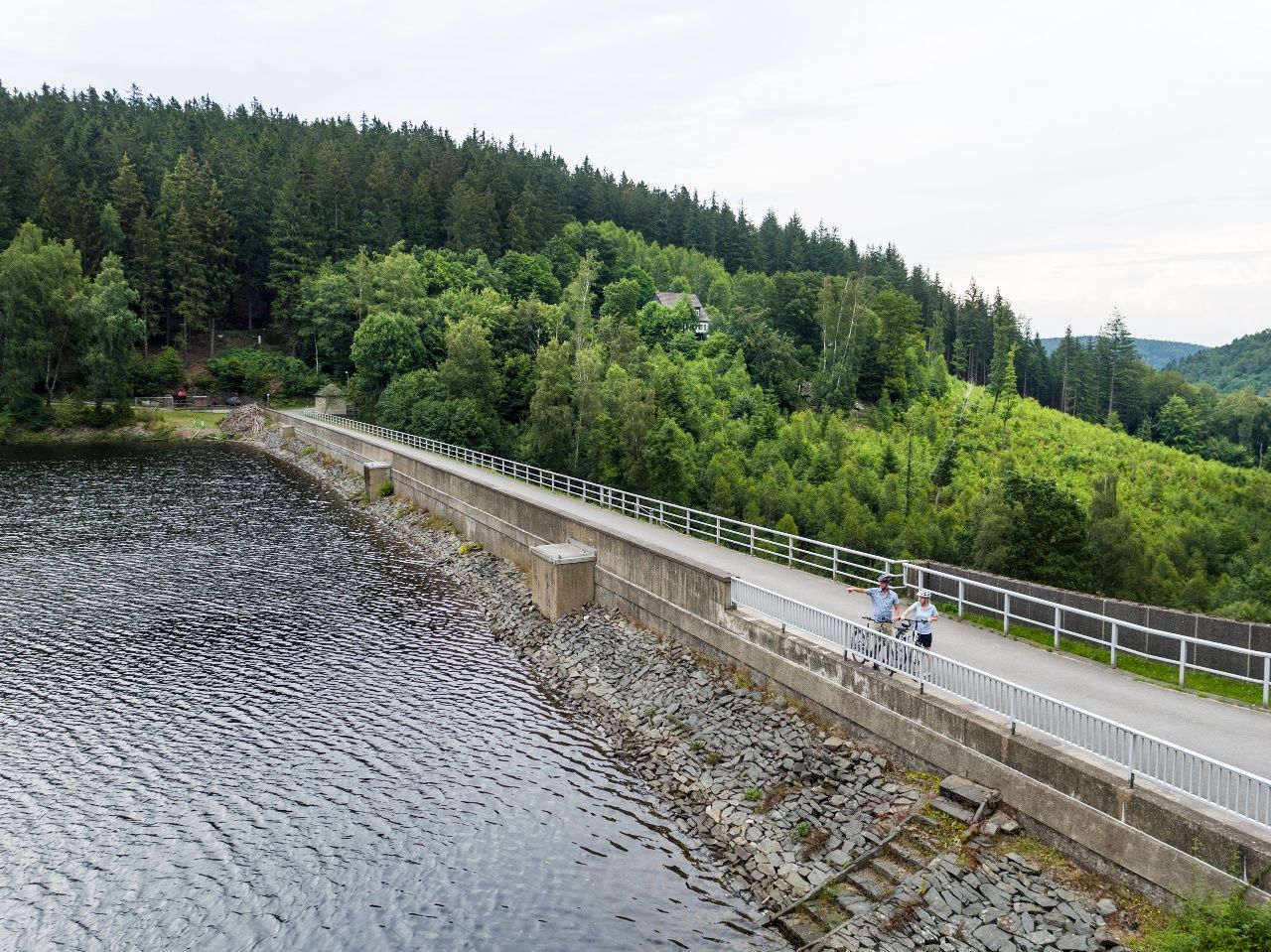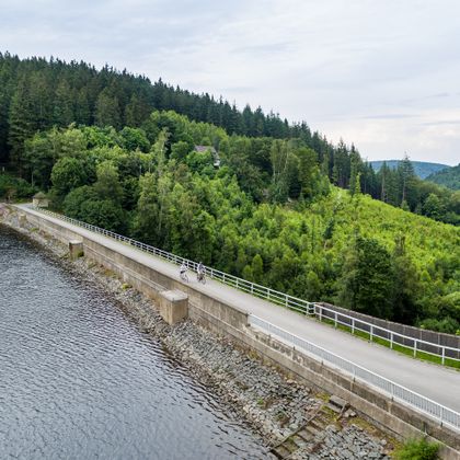 Wir folgen dem Westufer der Talsperre, passieren den sogenannten Kaiserfelsen und überqueren schließlich die Staumauer, die einen schönen Blick auf den See ermöglicht. Der Weg biegt nun gen Norden ab und wir tauchen ein in die dichte Waldlandschaft des Simmerather Waldes. Auf unserem Weg zur Dreilägerbachtalsperre wird es ohne elektronische Unterstützung nun sportlich, denn es geht auf und ab durch die Mittelgebirgslandschaft der Eifel.